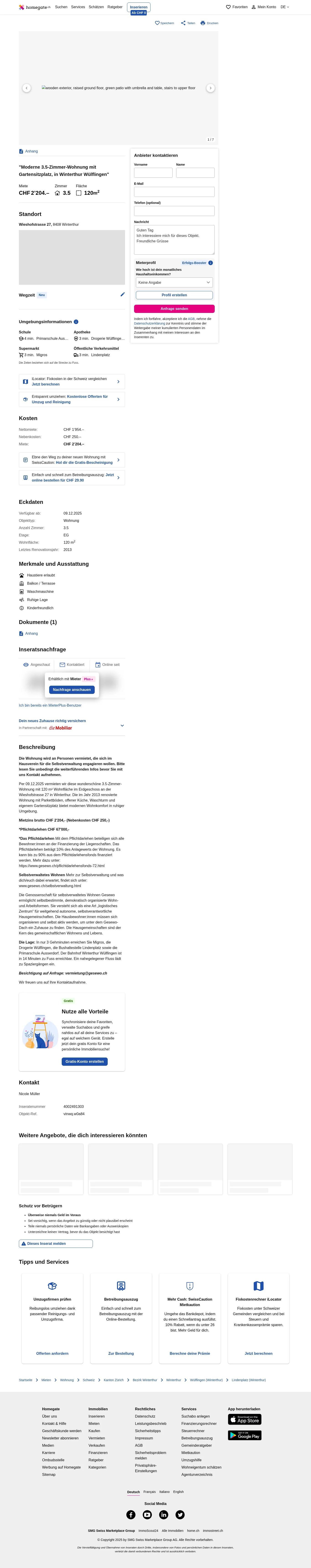 Per 09.12.2025 vermieten wir diese wunderschöne 3.5-Zimmer-Wohnung mit 117 m² Wohnfläche im Erdgeschoss an der Wieshofstrasse 27 in Winterthur. Die im Jahr 2013 renovierte Wohnung mit Parkettböden, offener Küche, Waschturm und eigenem Gartensitzplatz bietet modernen Wohnkomfort in ruhiger Umgebung.