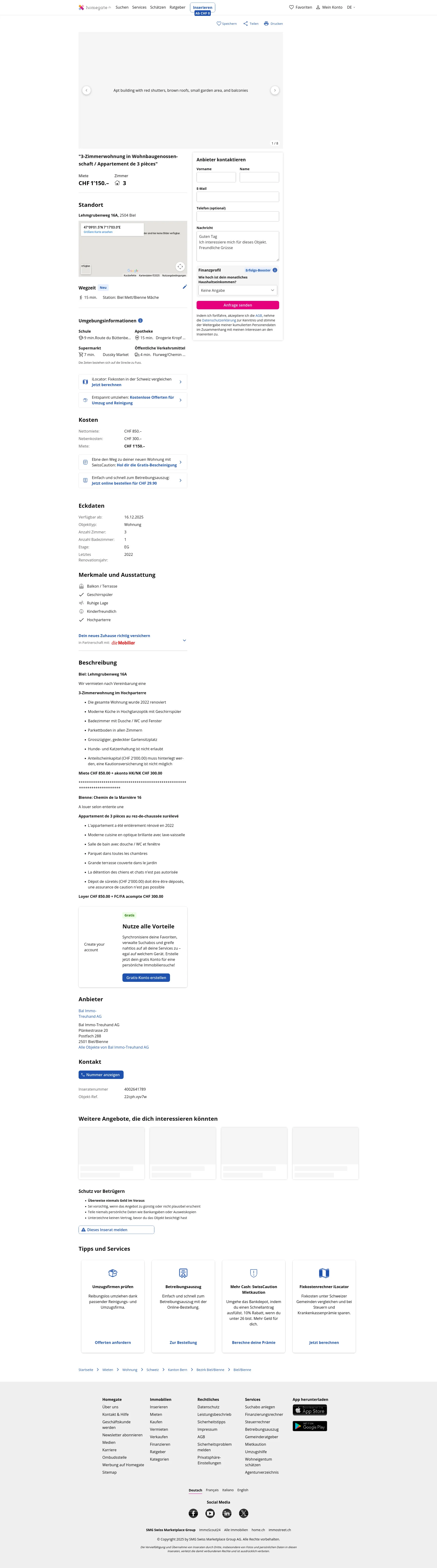 Miete CHF 850.00 + akonto HK/NK CHF 300.00