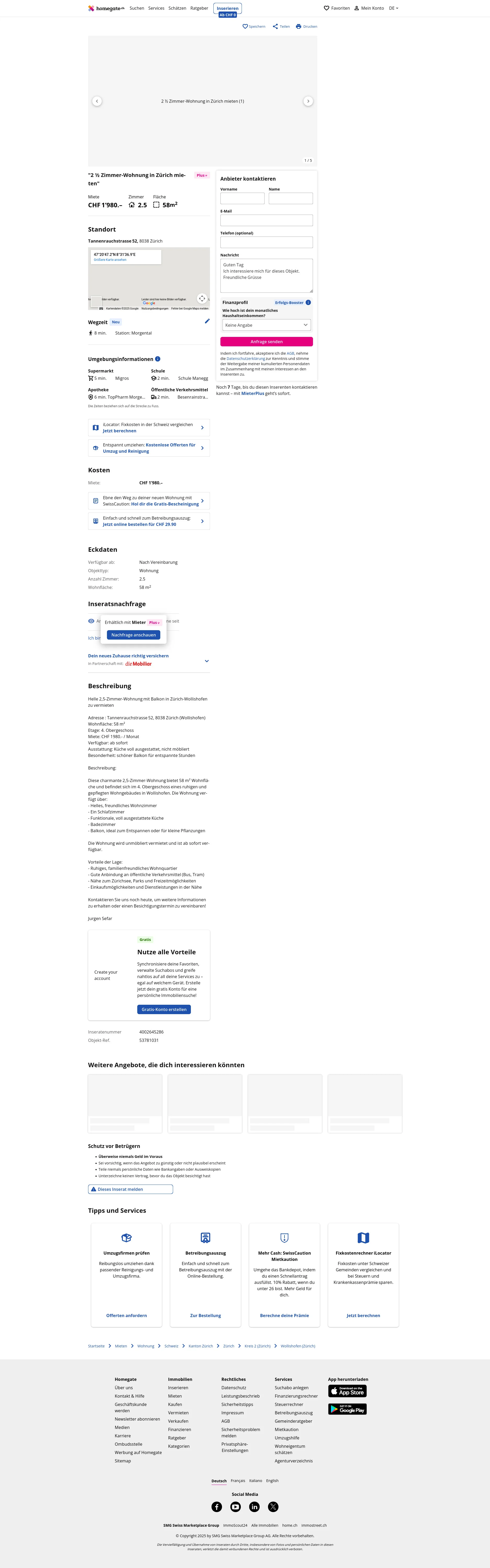 Adresse : Tannenrauchstrasse 52, 8038 Zürich (Wollishofen) Wohnfläche: 58 m² Etage: 4. Obergeschoss Miete: CHF 1980.- / Monat Verfügbar: ab sofort Ausstattung: Küche voll ausgestattet, nicht möbliert Besonderheit: schöner Balkon für entspannte Stunden