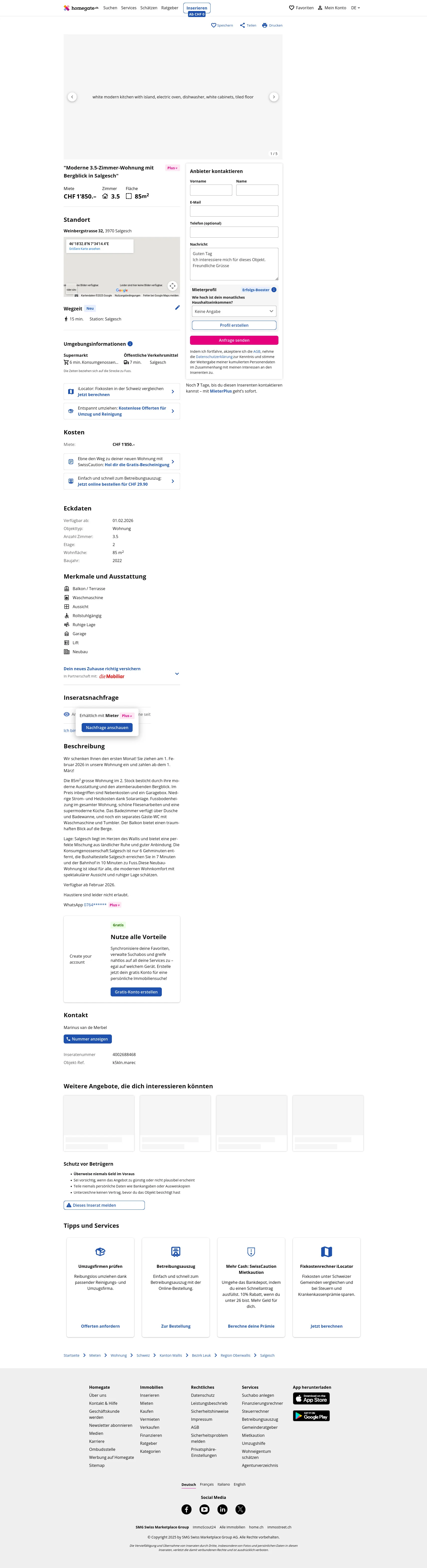 Lage: Salgesch liegt im Herzen des Wallis und bietet eine perfekte Mischung aus ländlicher Ruhe und guter Anbindung. Die Konsumgenossenschaft Salgesch ist nur 6 Gehminuten entfernt, die Bushaltestelle Salgesch erreichen Sie in 7 Minuten und der Bahnhof in 10 Minuten zu Fuss.Diese Neubau-Wohnung ist ideal für alle, die modernen Wohnkomfort mit spektakulärer Aussicht und ruhiger Lage schätzen.