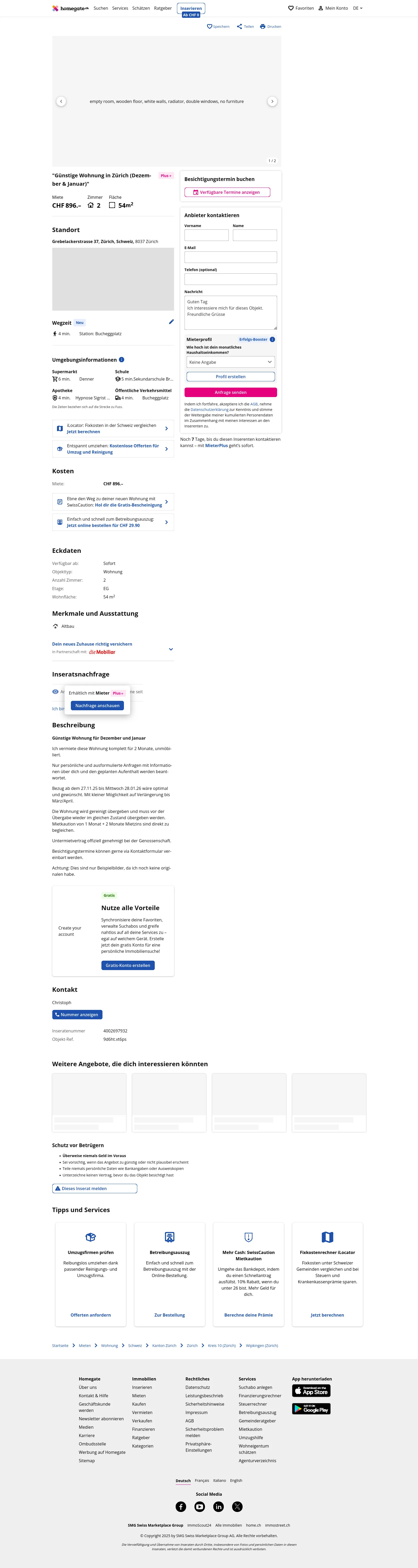 Die Wohnung wird gereinigt übergeben und muss vor der Übergabe wieder im gleichen Zustand übergeben werden. Mietkaution von 1 Monat + 2 Monate Mietzins sind direkt zu begleichen.