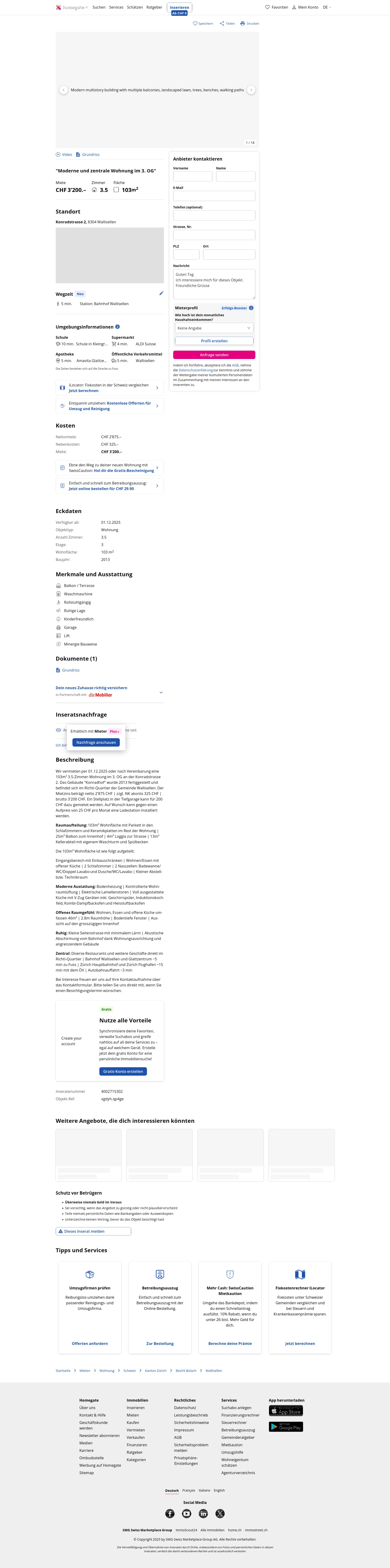 Wir vermieten per 01.12.2025 oder nach Vereinbarung eine 103m² 3.5-Zimmer-Wohnung im 3. OG an der Konradstrasse 2. Das Gebäude "Konradhof" wurde 2013 fertiggestellt und befindet sich im Richti-Quartier der Gemeinde Wallisellen. Der Mietzins beträgt netto 2'875 CHF | zzgl. NK akonto 325 CHF | brutto 3'200 CHF. Ein Stellplatz in der Tiefgarage kann für 200 CHF dazu gemietet werden. Auf Wunsch kann gegen einen Aufpreis von 25 CHF pro Monat eine Ladestation installiert werden.
