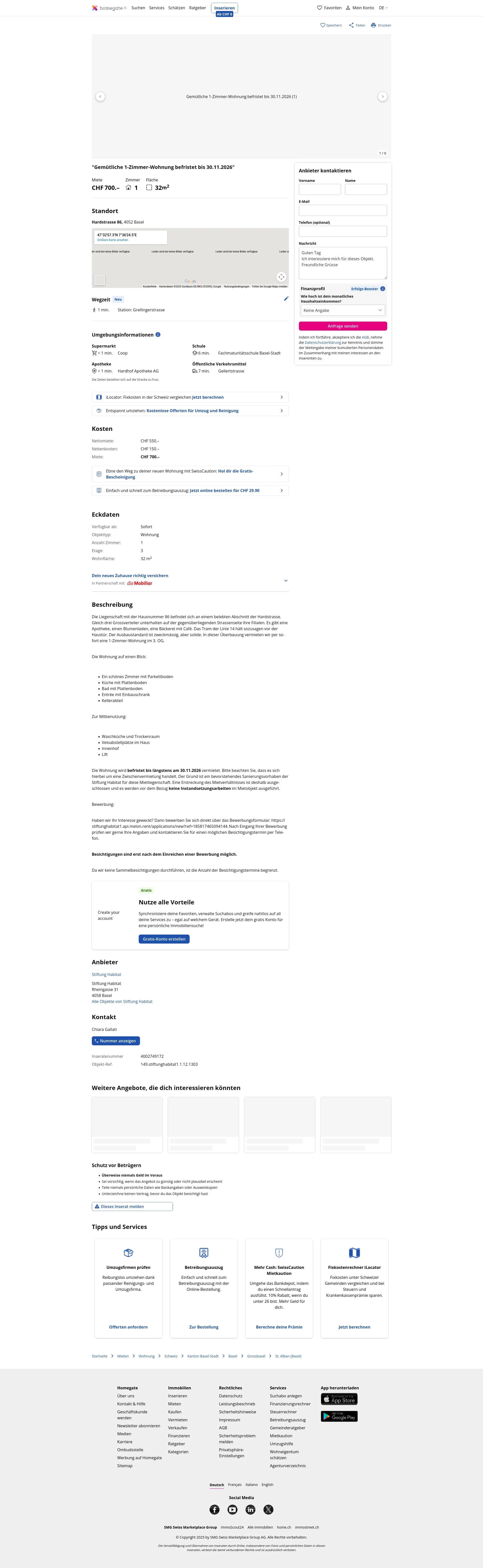 Die Wohnung wird befristet bis längstens am 30.11.2026 vermietet. Bitte beachten Sie, dass es sich hierbei um eine Zwischenvermietung handelt. Der Grund ist ein bevorstehendes Sanierungsvorhaben der Stiftung Habitat für diese Mietliegenschaft. Eine Erstreckung des Mietverhältnisses ist deshalb ausgeschlossen und es werden vor dem Bezug keine Instandsetzungsarbeiten im Mietobjekt ausgeführt.