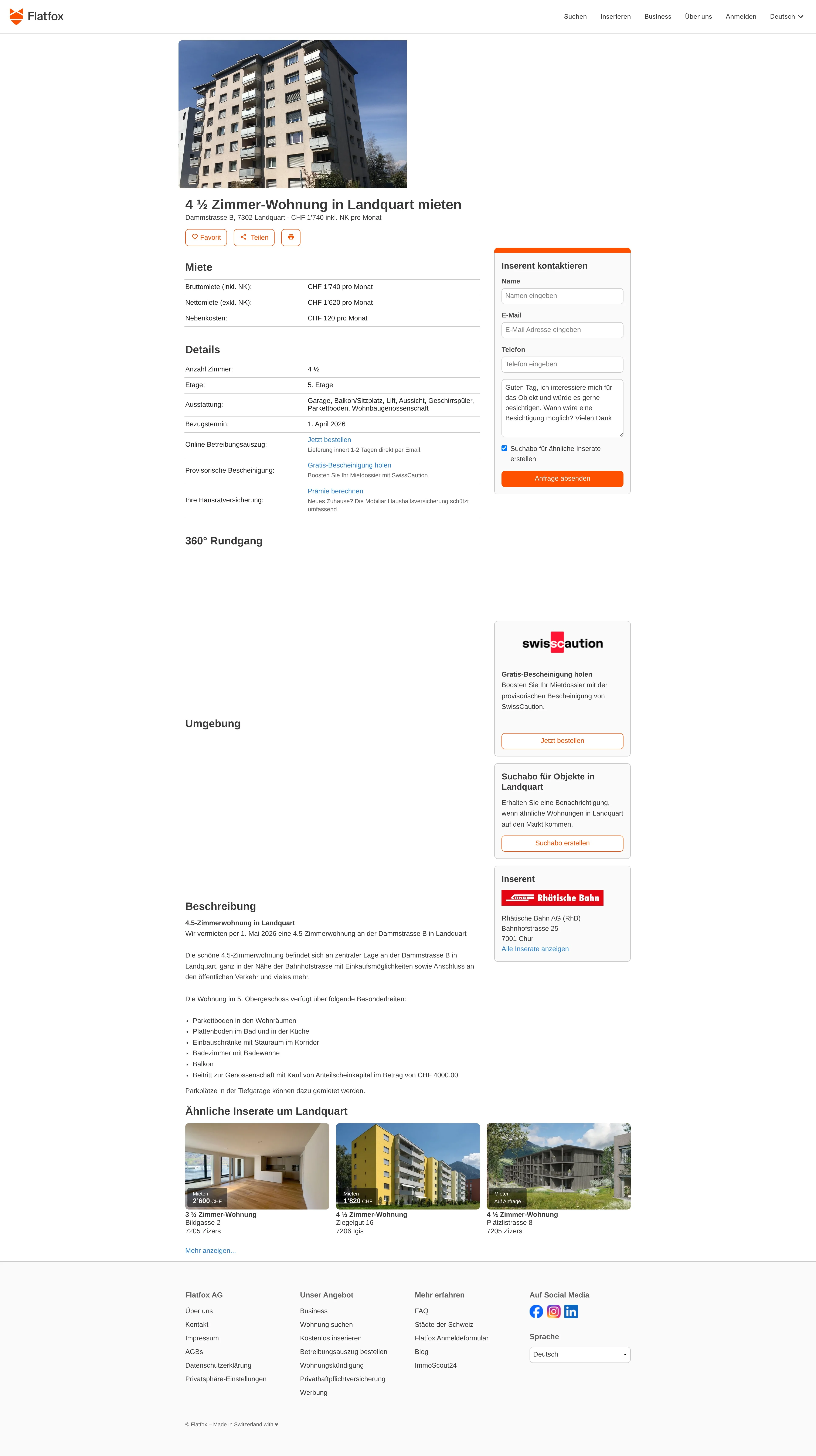 Diese 4.5-Zimmerwohnung an der Dammstrasse B, 7302 Landquart liegt zentral in der Nähe der Bahnhofstrasse mit Einkaufsmöglichkeiten sowie Anschluss an den öffentlichen Verkehr. Die Wohnung befindet sich im 5. Obergeschoss.