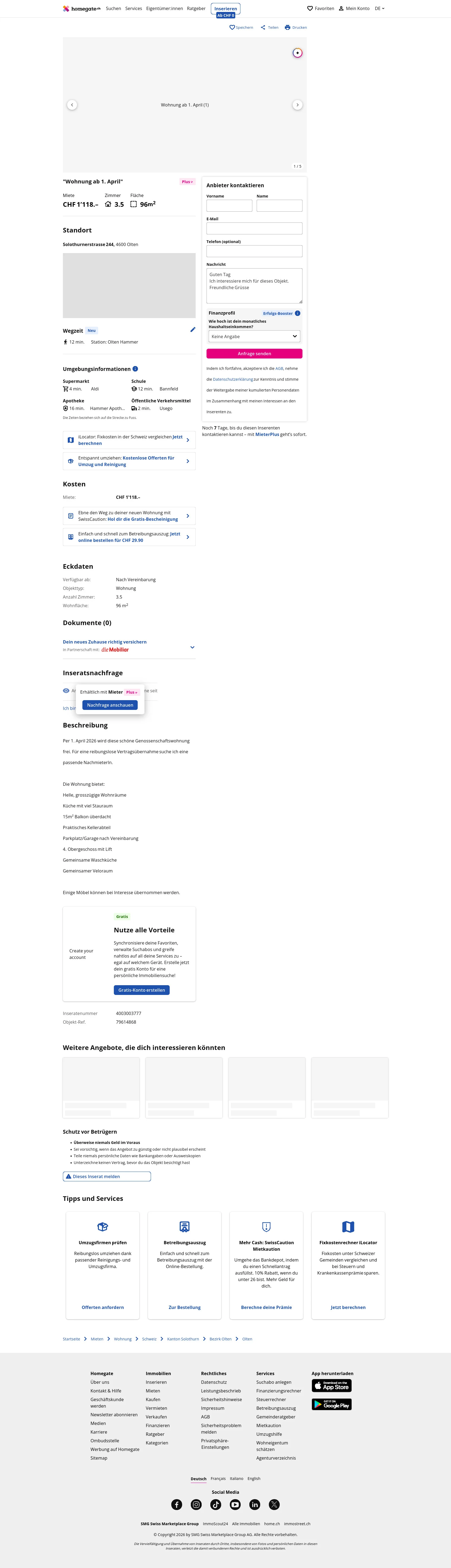 Diese 3.5-Zimmer-Wohnung in Olten (4600) bietet 96 m² Wohnfläche und wird per 1. April 2026 frei. Die Wohnung gehört zur Wohnbau-Genossenschaft Olten und Umgebung.