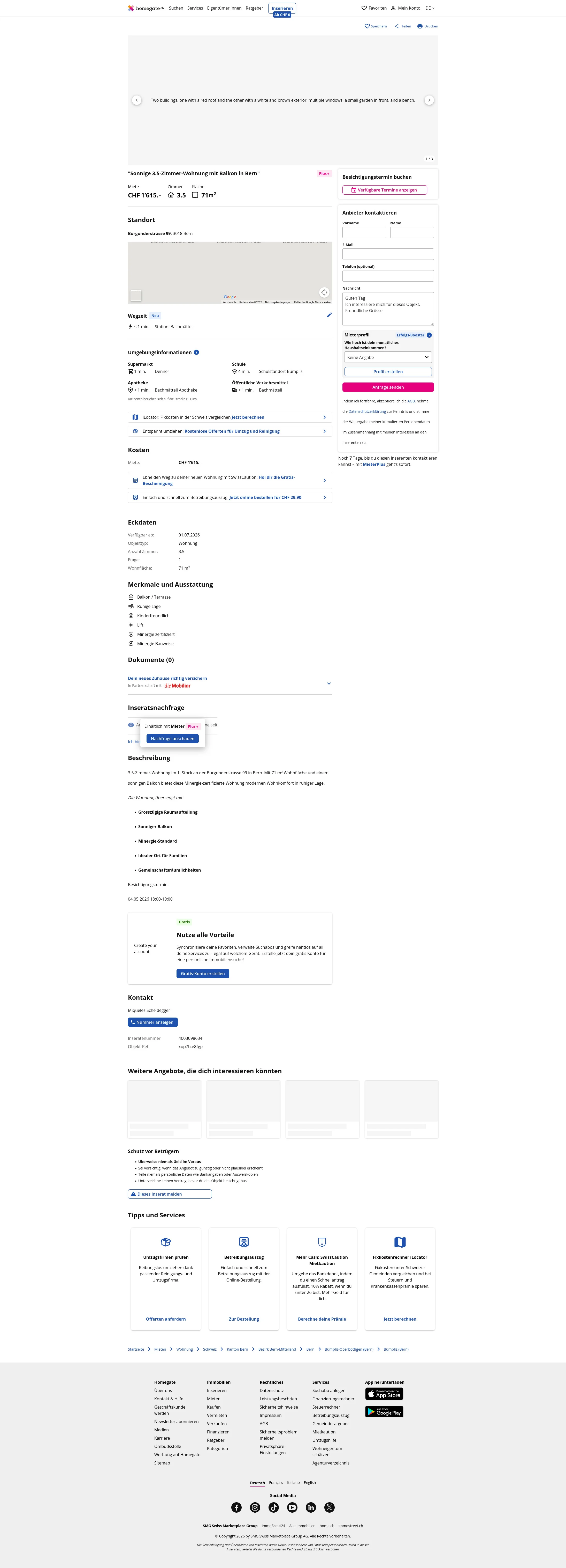 Diese 3.5-Zimmer-Wohnung im 1. Stock an der Burgunderstrasse 99, 3018 Bern bietet 71 m² Wohnfläche und einen sonnigen Balkon. Die Wohnung entspricht dem Minergie-Standard.