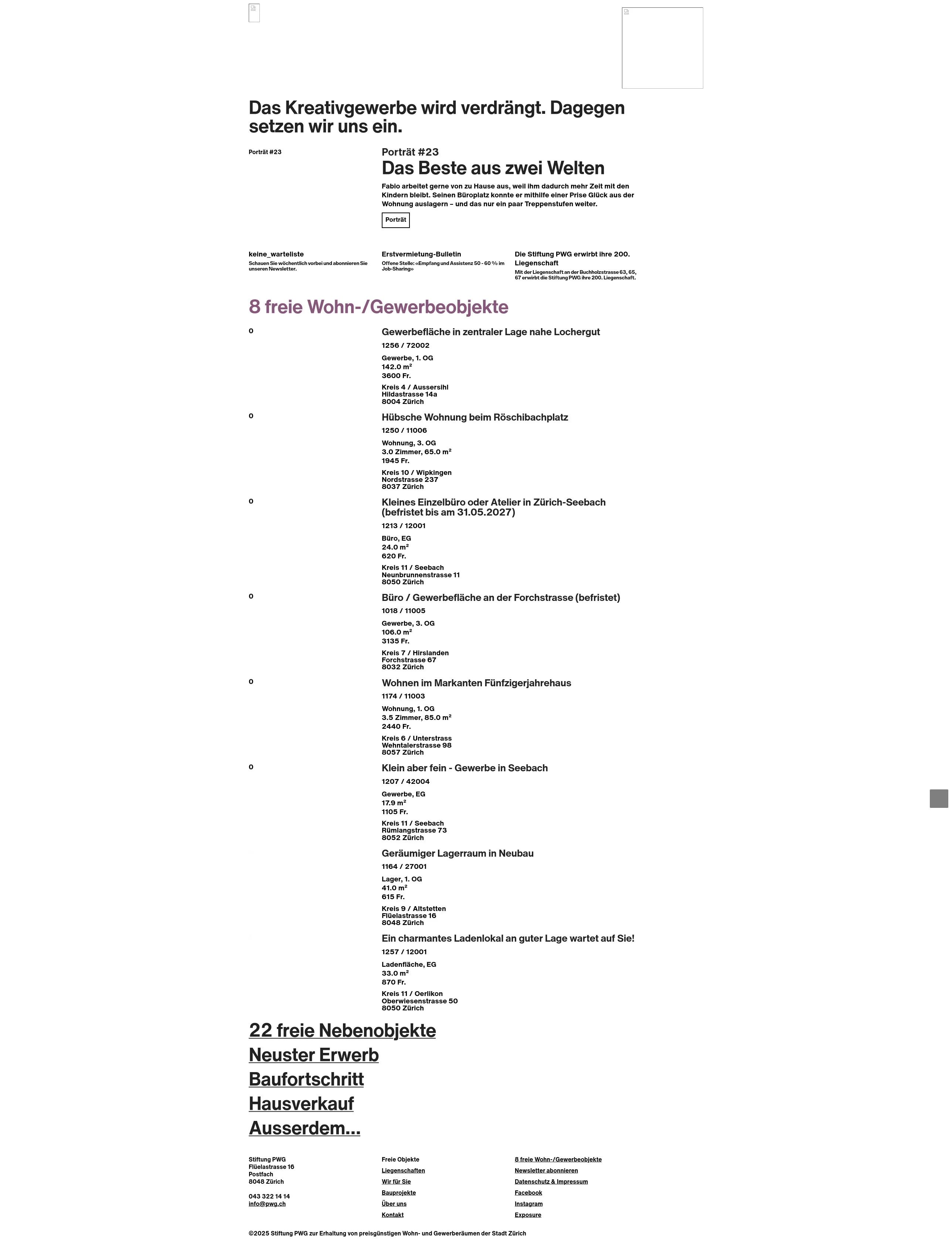 | Belegungsvorschriften | Einkommensobergrenze pro Haushalt: CHF 117'120.-; Vermögensobergrenze pro Haushalt: CHF 200'000.-; Besichtigung nur nach Einreichung der vollständigen Bewerbungsunterlagen und engerer Auswahl (Frist: bis Samstag, 4. Oktober 2025, 16:30 Uhr); Es wird keine Warteliste geführt. |