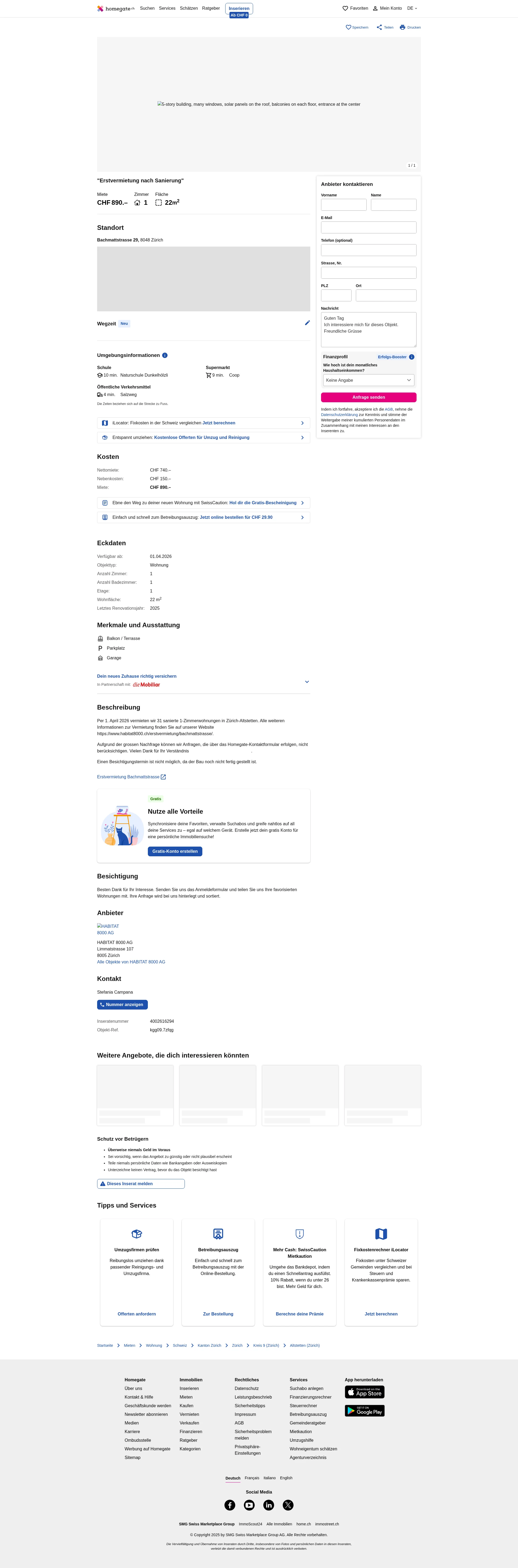 Per 1. April 2026 vermieten wir 31 sanierte 1-Zimmerwohnungen in Zürich-Altstetten. Alle weiteren Informationen zur Vermietung finden Sie auf unserer Website https://www.habitat8000.ch/erstvermietung/bachmattstrasse/.