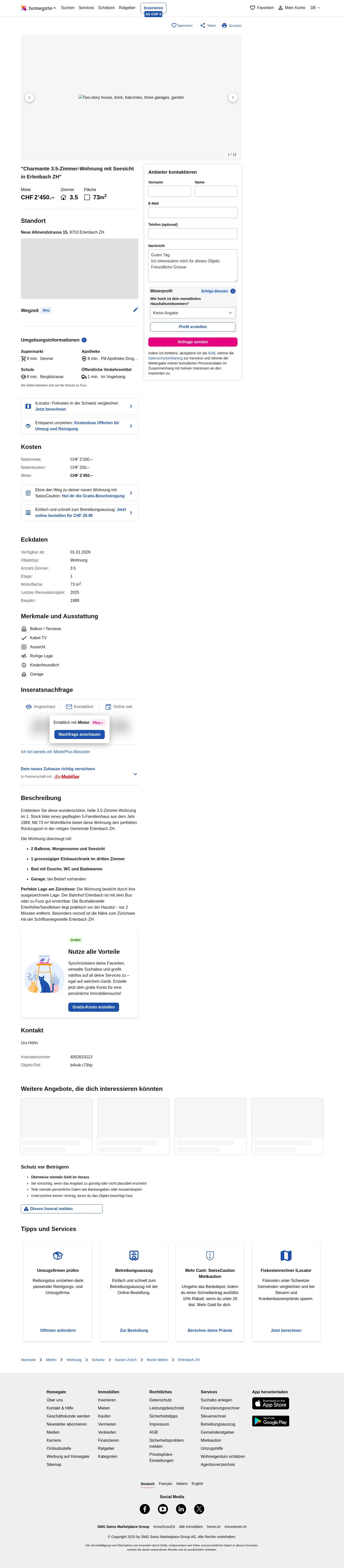 Entdecken Sie diese wunderschöne, helle 3.5-Zimmer-Wohnung im 1. Stock links eines gepflegten 5-Familienhaus aus dem Jahr 1989. Mit 73 m² Wohnfläche bietet diese Wohnung den perfekten Rückzugsort in der ruhigen Gemeinde Erlenbach ZH.