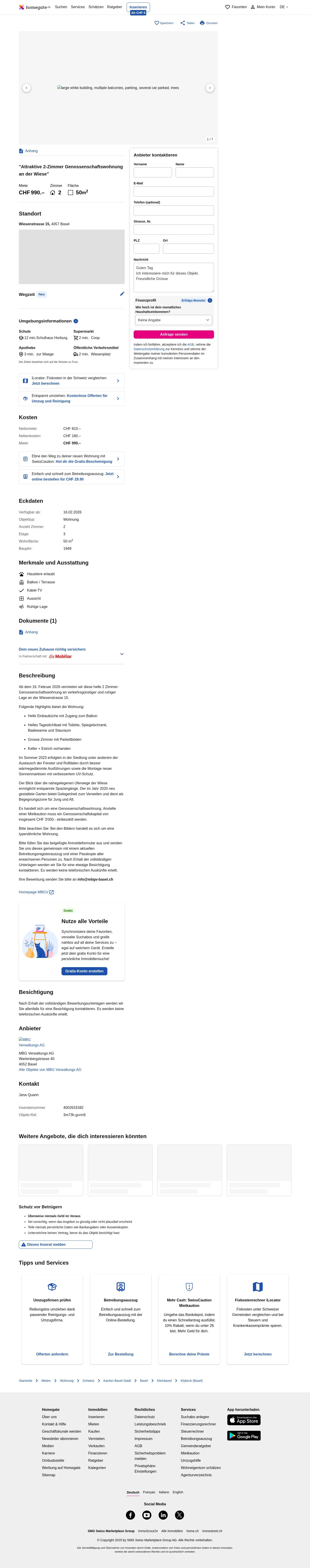Ab dem 16. Februar 2026 vermieten wir diese helle 2 Zimmer-Genossenschaftswohnung an verkehrsgünstiger und ruhiger Lage an der Wiesenstrasse 15.