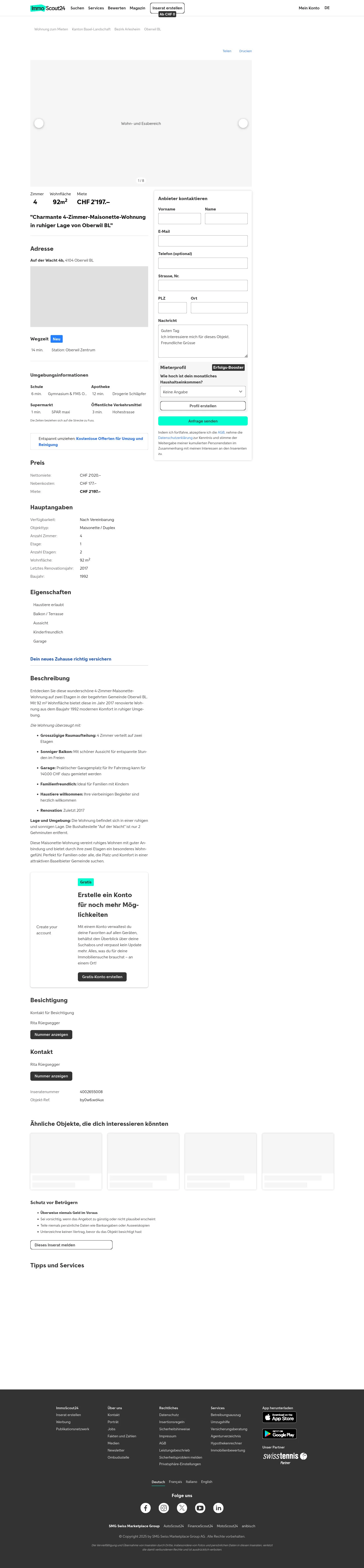 Entdecken Sie diese wunderschöne 4-Zimmer-Maisonette-Wohnung auf zwei Etagen in der begehrten Gemeinde Oberwil BL. Mit 92 m² Wohnfläche bietet diese im Jahr 2017 renovierte Wohnung aus dem Baujahr 1992 modernen Komfort in ruhiger Umgebung.
