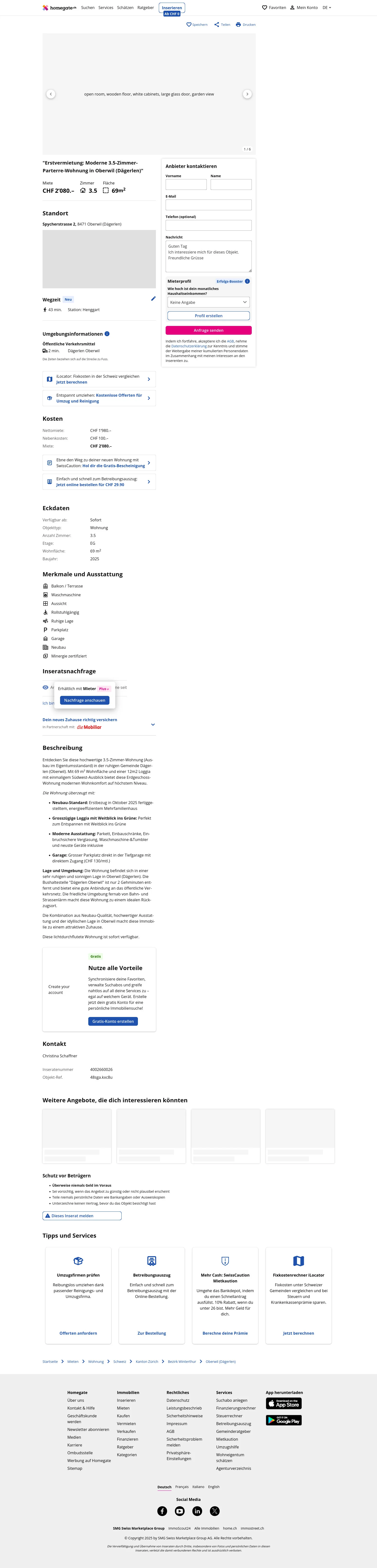 Entdecken Sie diese hochwertige 3.5-Zimmer-Wohnung (Ausbau im Eigentumsstandard) in der ruhigen Gemeinde Dägerlen (Oberwil). Mit 69 m² Wohnfläche und einer 12m2 Loggia mit einmaligem Südwest-Ausblick bietet diese Erdgeschoss-Wohnung modernen Wohnkomfort auf höchstem Niveau.