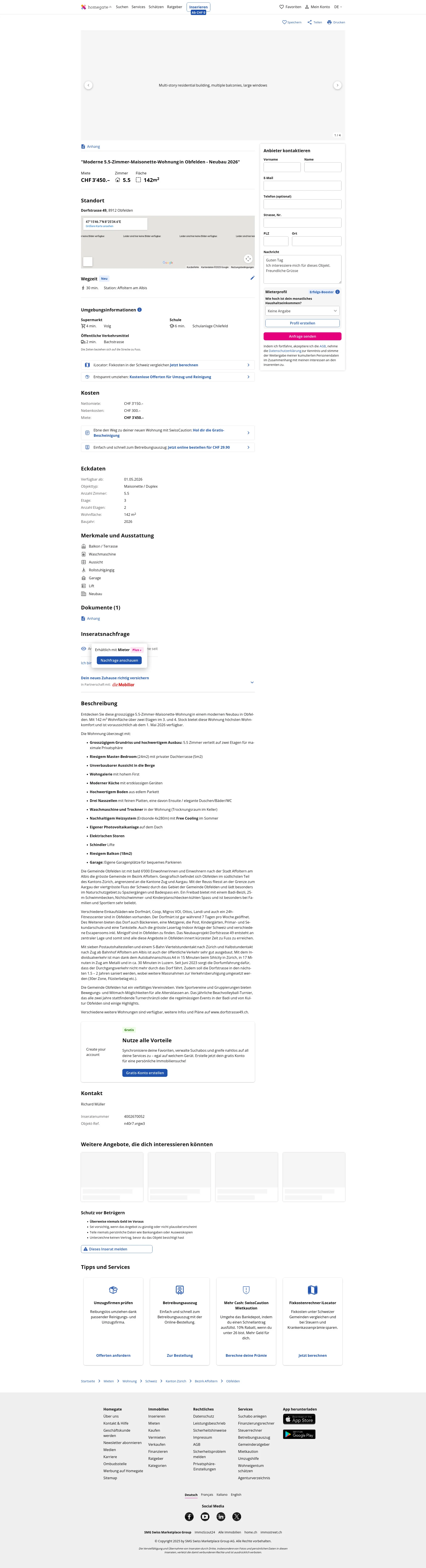 Entdecken Sie diese grosszĂŒgige 5.5-Zimmer-Maisonette-Wohnung in einem modernen Neubau in Obfelden. Mit 142 mÂČ WohnflĂ€che ĂŒber zwei Etagen im 3. und 4. Stock bietet diese Wohnung höchsten Wohnkomfort und ist voraussichtlich ab dem 1. Mai 2026 verfĂŒgbar.