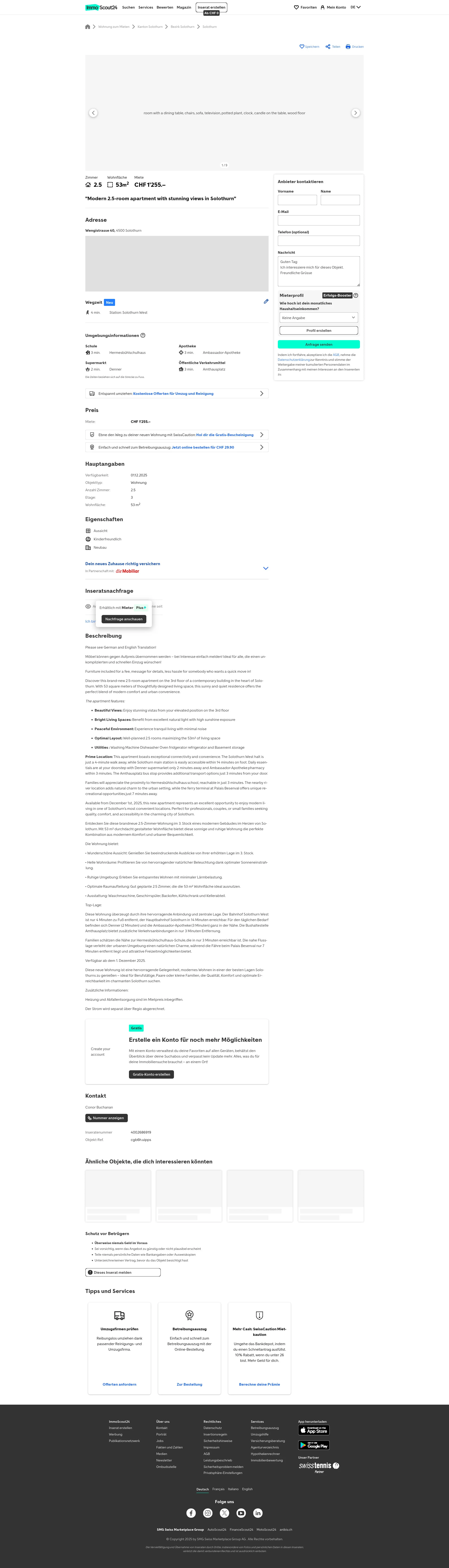 Available from December 1st, 2025, this new apartment represents an excellent opportunity to enjoy modern living in one of Solothurn's most convenient locations. Perfect for professionals, couples, or small families seeking quality, comfort, and accessibility in the charming city of Solothurn.