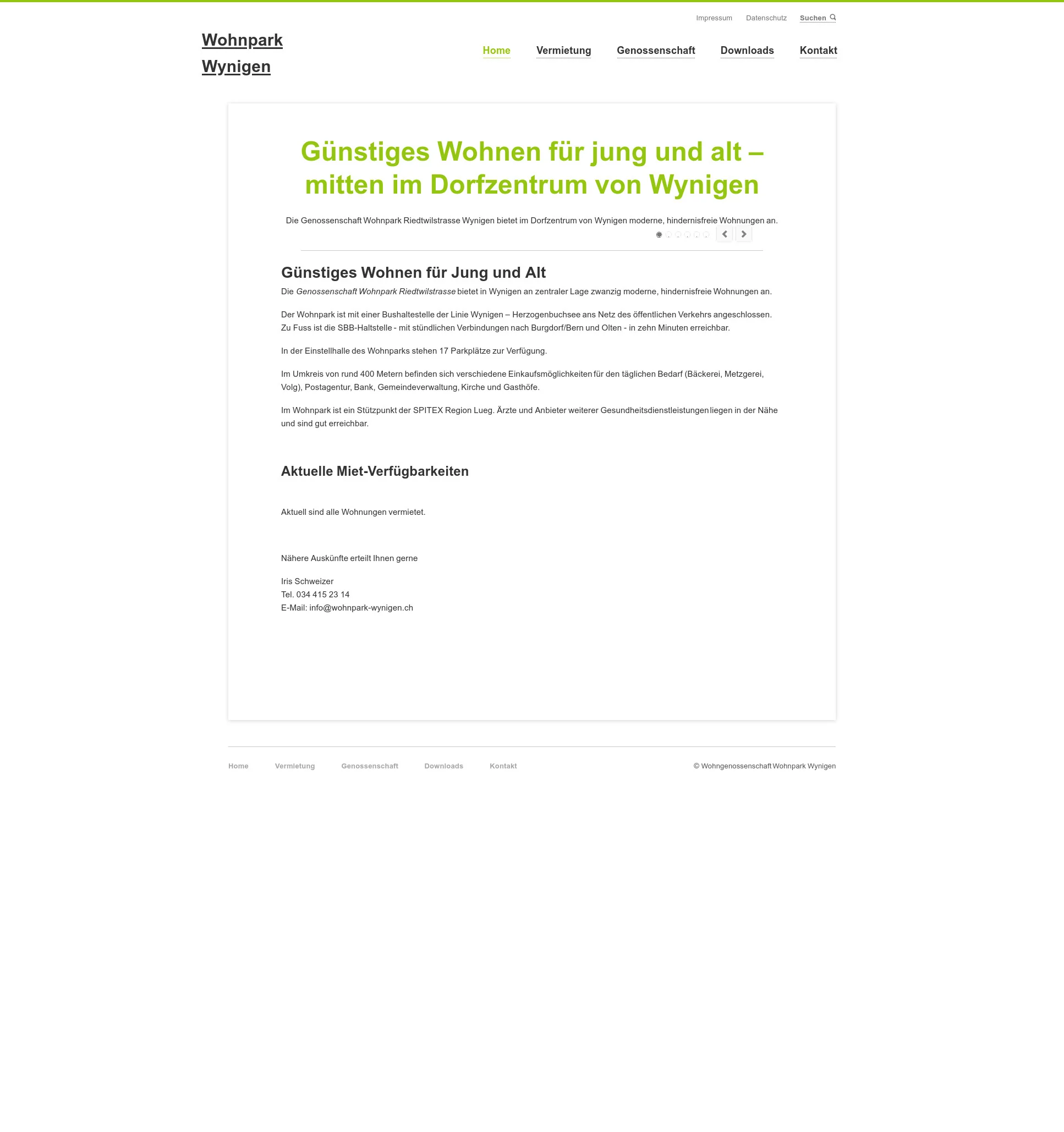 Die Genossenschaft Wohnpark Riedtwilstrasse Wynigen bietet im Dorfzentrum von Wynigen moderne, hindernisfreie Wohnungen an. Der Wohnpark bietet an zentraler Lage zwanzig moderne, hindernisfreie Wohnungen. Der Wohnpark ist mit einer Bushaltestelle der Linie Wynigen – Herzogenbuchsee ans Netz des öffentlichen Verkehrs angeschlossen; die SBB-Haltstelle ist in zehn Minuten erreichbar. In der Einstellhalle stehen 17 Parkplätze zur Verfügung. Im Umkreis von rund 400 Metern befinden sich Einkaufsmöglichkeiten, Postagentur, Bank, Gemeindeverwaltung, Kirche und Gasthöfe. Im Wohnpark ist ein Stützpunkt der SPITEX Region Lueg. Aktuell sind alle Wohnungen vermietet. Für Auskünfte: Iris Schweizer, Tel. 034 415 23 14, E-Mail: