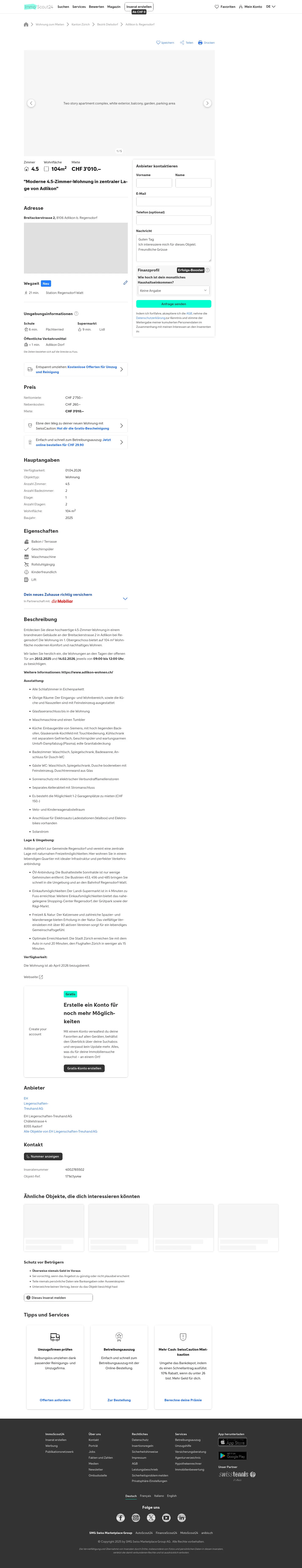 Entdecken Sie diese hochwertige 4.5-Zimmer-Wohnung in einem brandneuen Gebäude an der Breitackerstrasse 2 in Adlikon bei Regensdorf. Die Wohnung im 1. Obergeschoss bietet auf 104 m² Wohnfläche modernen Komfort und nachhaltiges Wohnen.