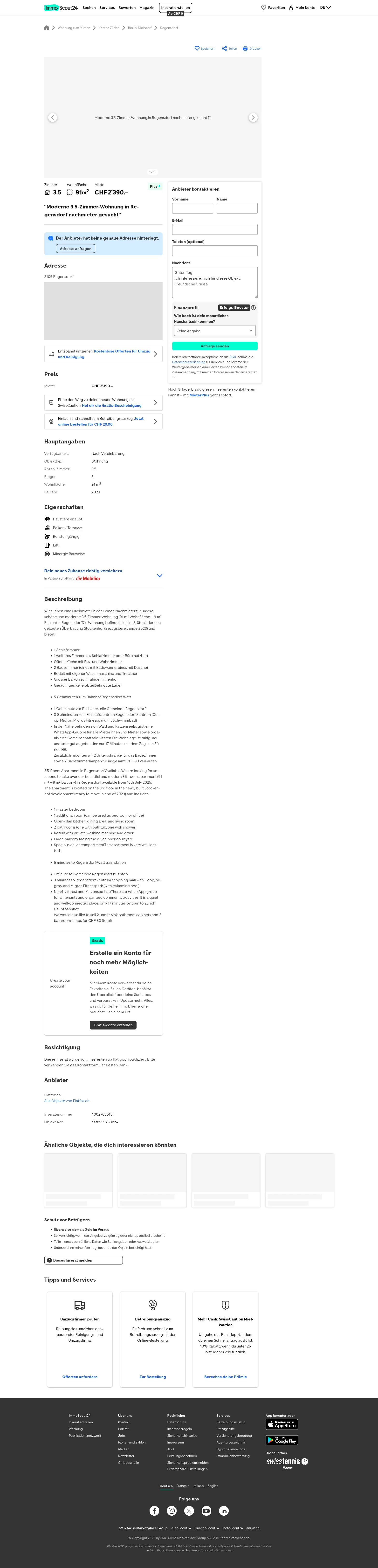 3.5-Room Apartment in Regensdorf Available We are looking for someone to take over our beautiful and modern 3.5-room apartment (91 m² + 9 m² balcony) in Regensdorf, available from 16th July 2025.