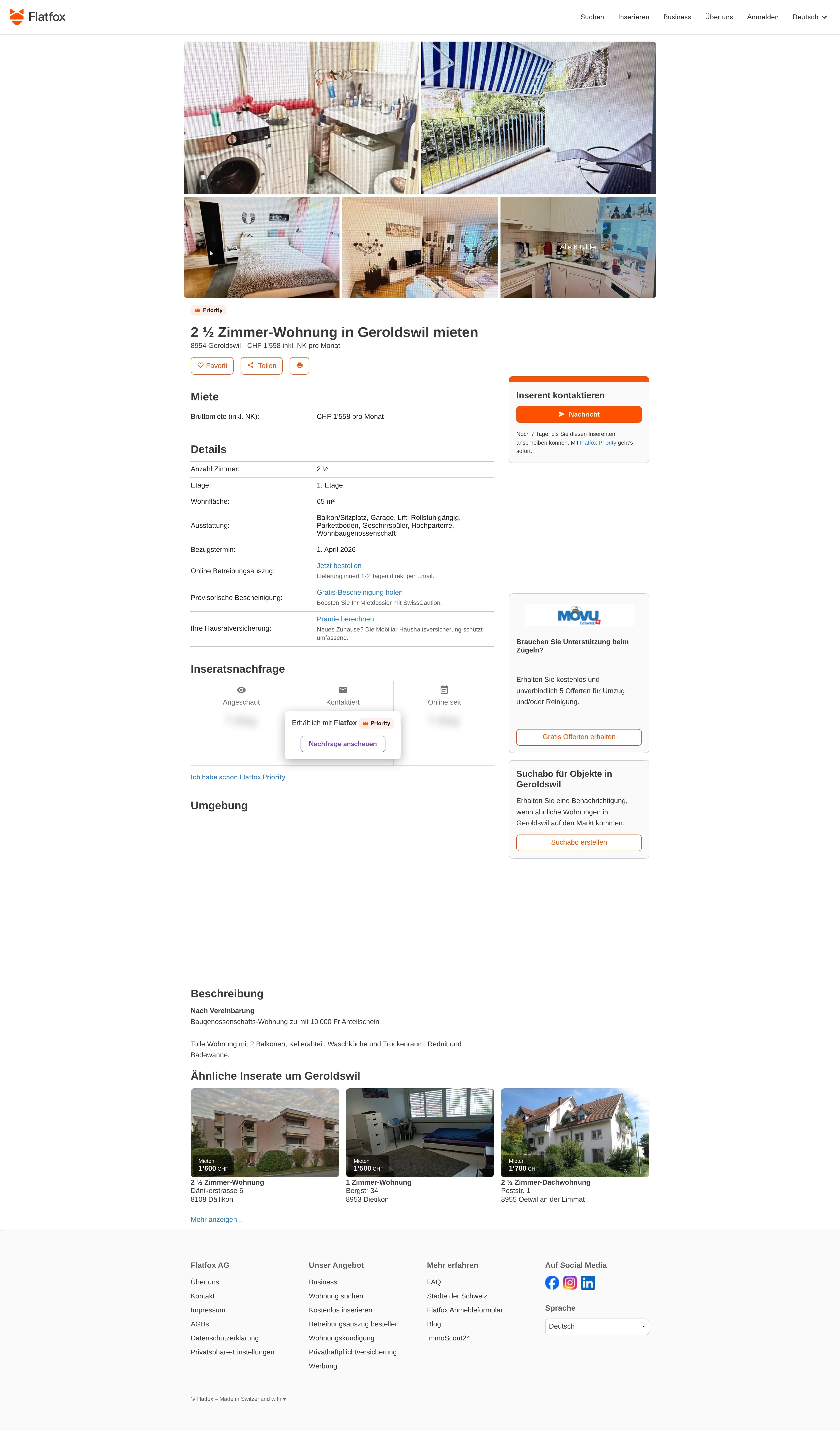This 2.5-room apartment in Geroldswil (8954) offers 65 m² of living space within a cooperative housing project.