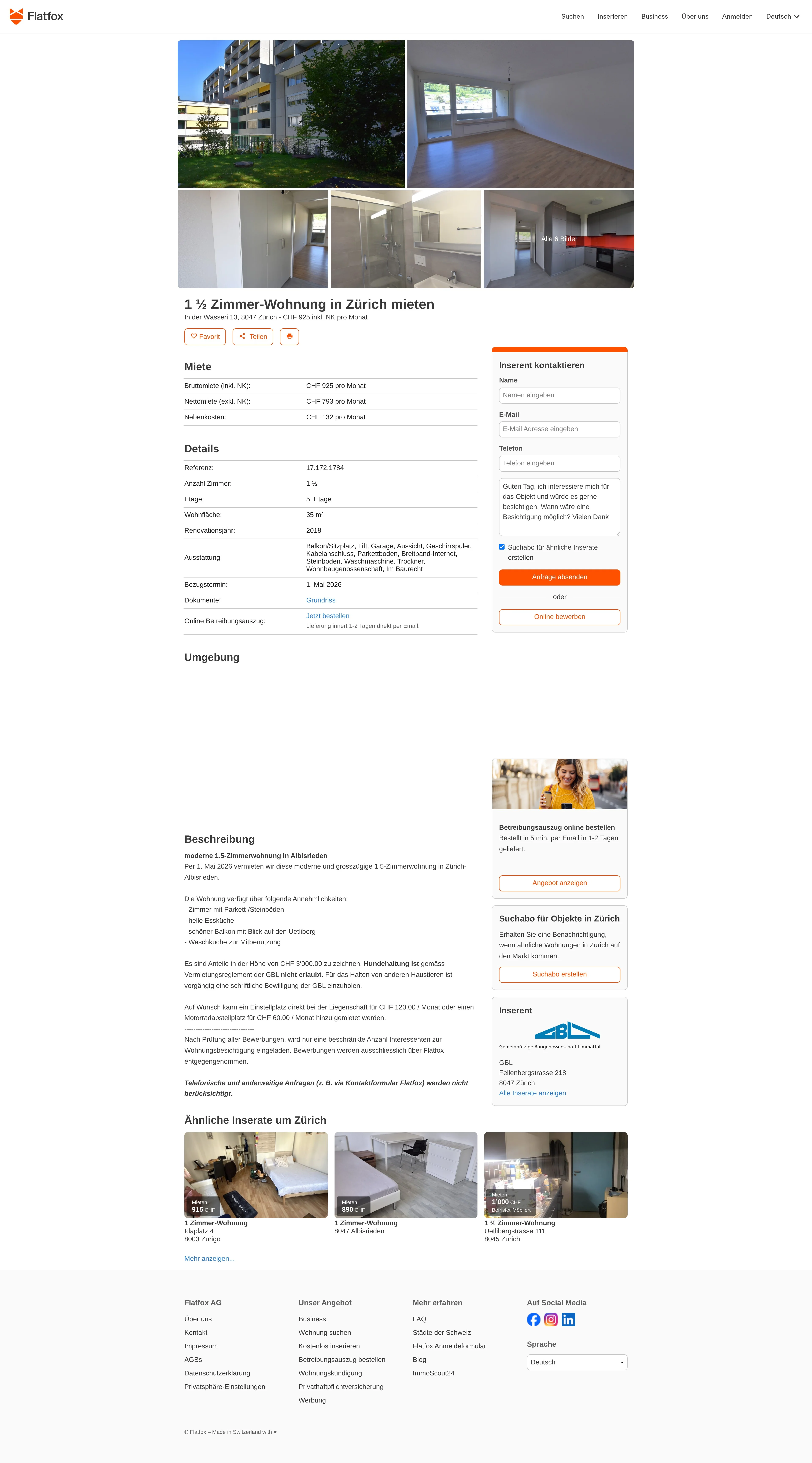 This 1.5-room apartment in Zürich-Albisrieden (8047) offers 35 m² of living space and is available from 1 May 2026.