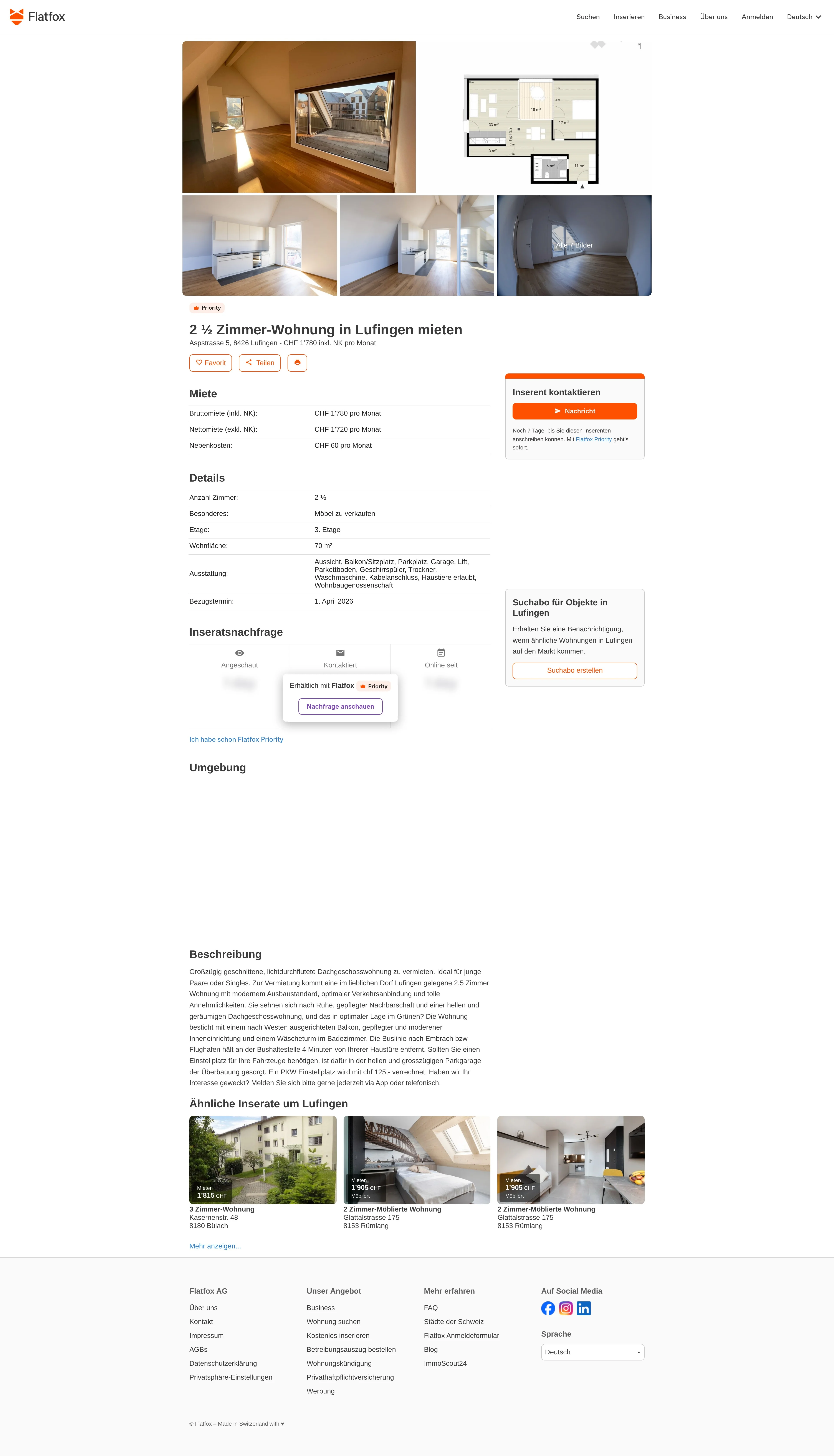 This generously proportioned, bright top-floor 2.5-room apartment in Lufingen (8426) offers 70 m² of living space.