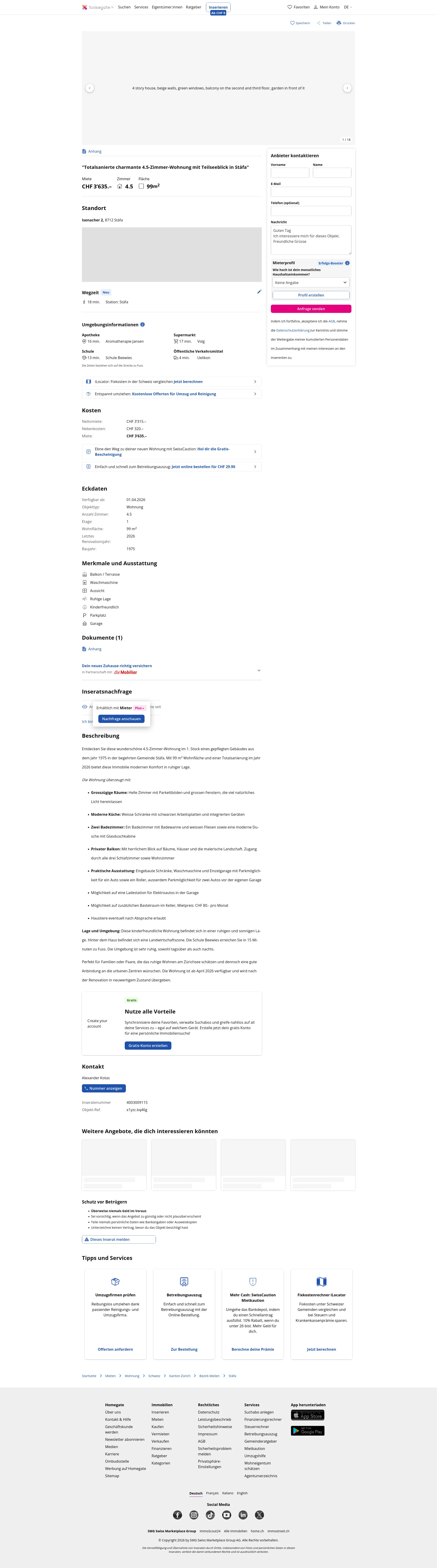 This 4.5-room apartment on the 1st floor of a well-maintained building from 1975 in Stäfa (8712) offers 99 m² of living space. The apartment underwent a full renovation in 2026 and will be handed over in like-new condition.
