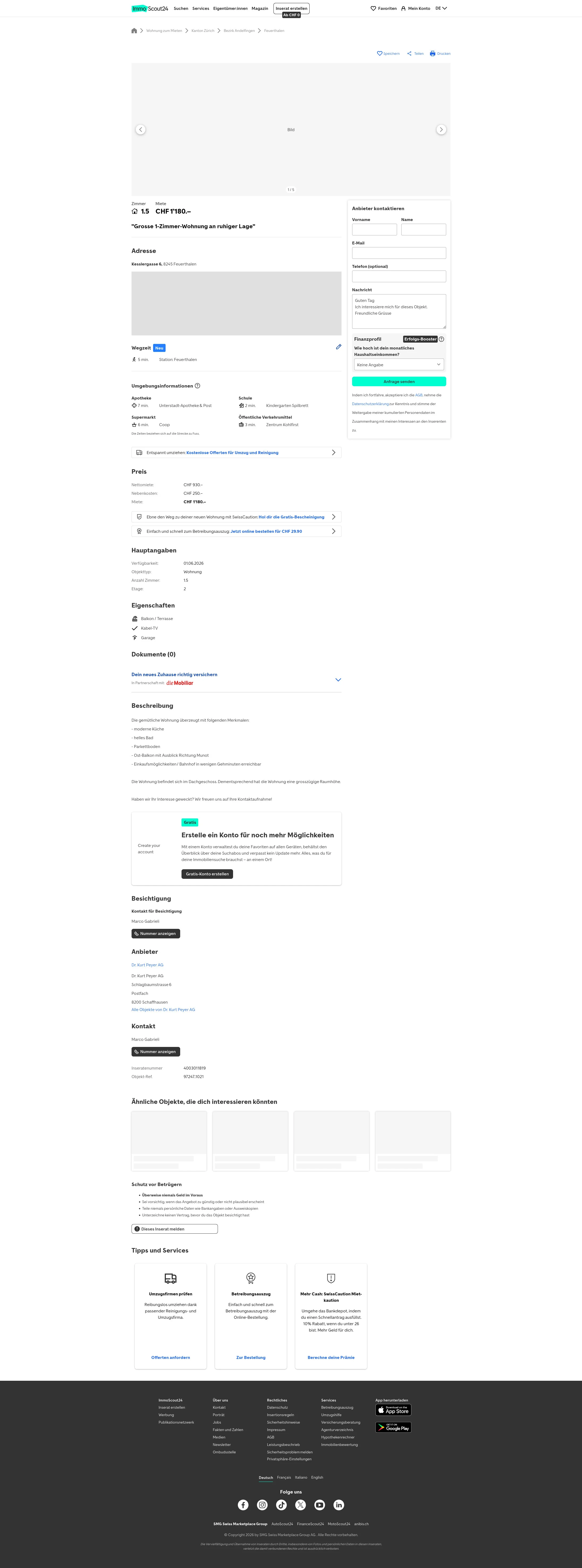 1.5-room apartment in Feuerthalen (Postal Code 8245). Rent: CHF 1,180/month. Cooperative: WOGESA Wohnbaugenossenschaft Schaffhausen.