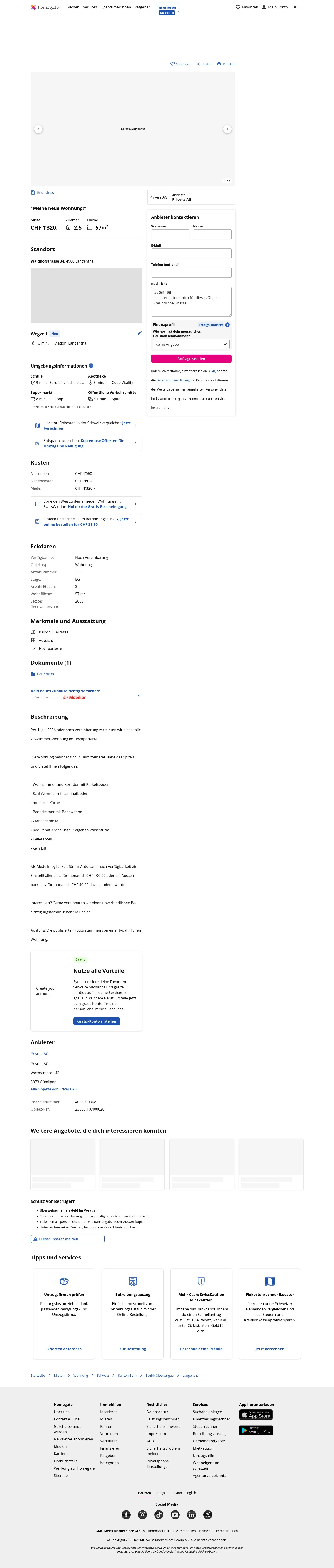 This 2.5-room apartment in Langenthal (4900) offers 57 m² of living space and is available from 1 July 2026 or by arrangement. The cooperative is Logis Suisse AG.