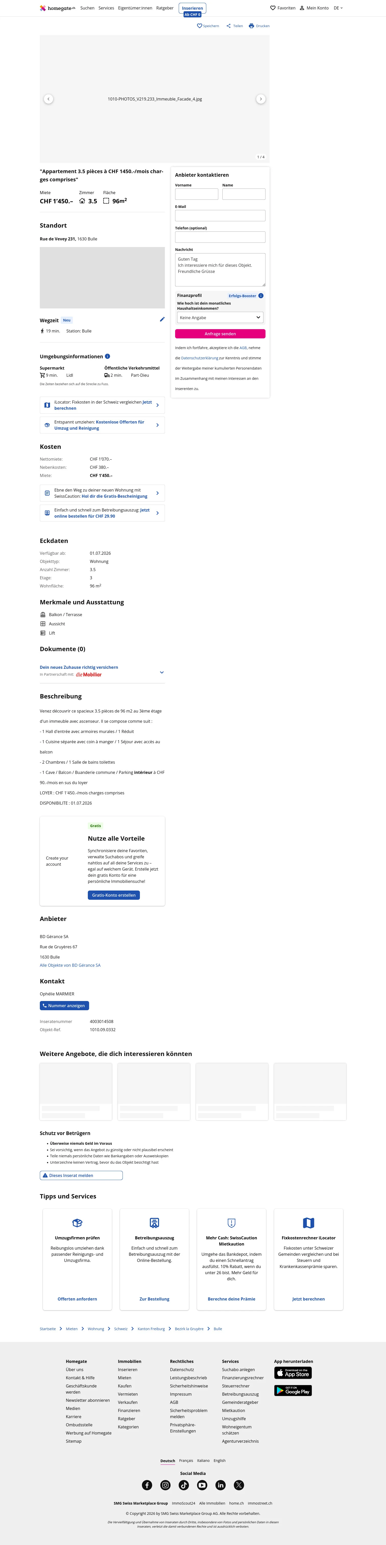 This 3.5-room apartment in Bulle (1630) offers 96 m² of living space on the 3rd floor of a building with an elevator.