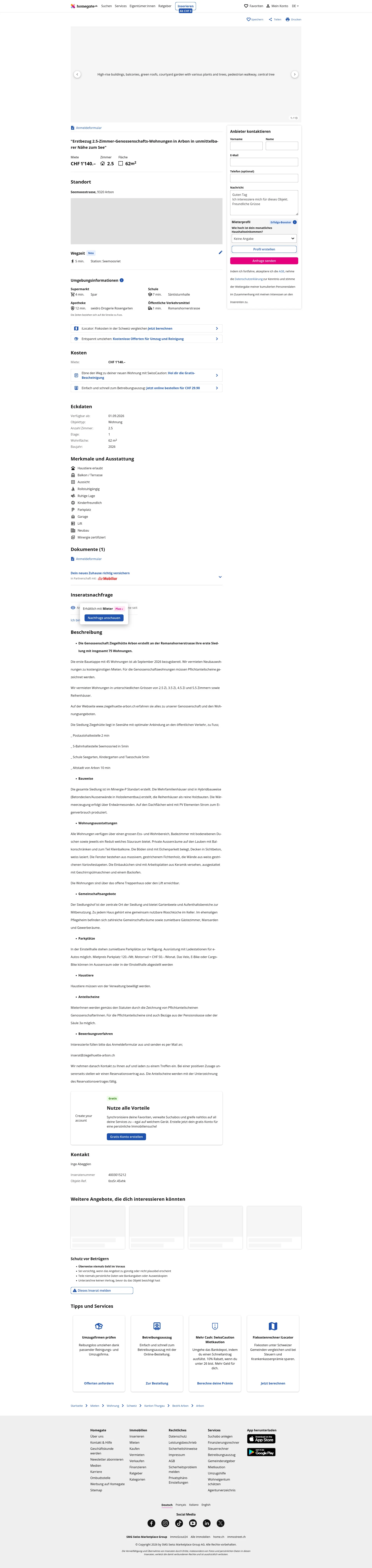 This 2.5-room apartment in Arbon (9320) offers 62 m² of living space. The rent is CHF 1,140/month. The apartment is available from 01.09.2026. The project is developed by Genossenschaft Ziegelhütte Arbon on Romanshornerstrasse.