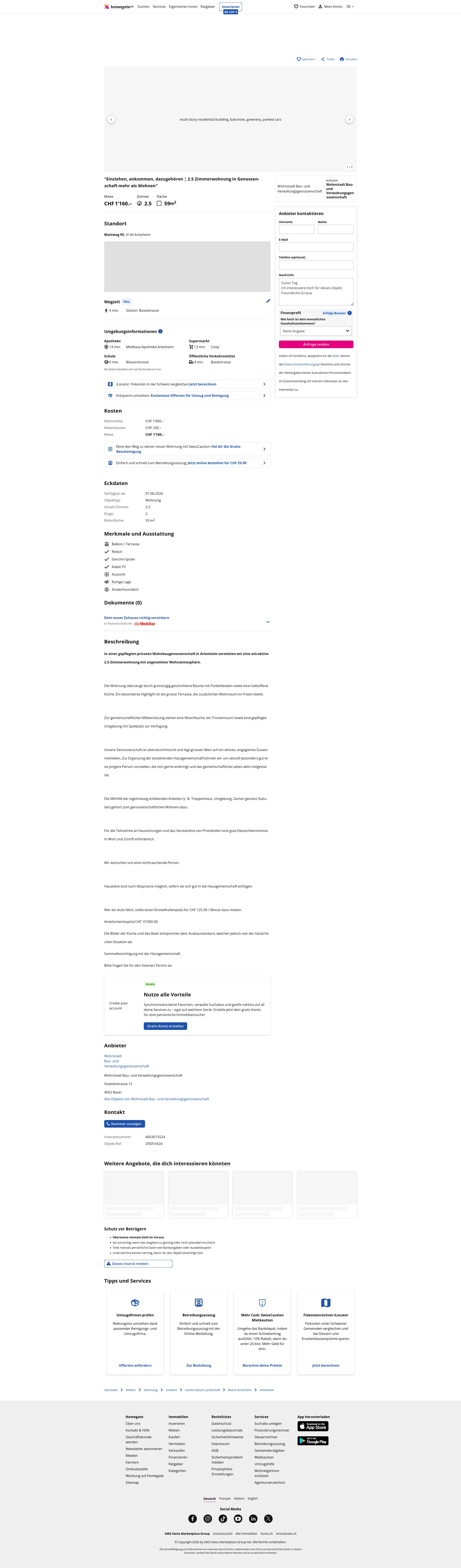 This 2.5-room apartment in Arlesheim (4144) offers 59 m² of living space and is located in a well-maintained private housing cooperative.