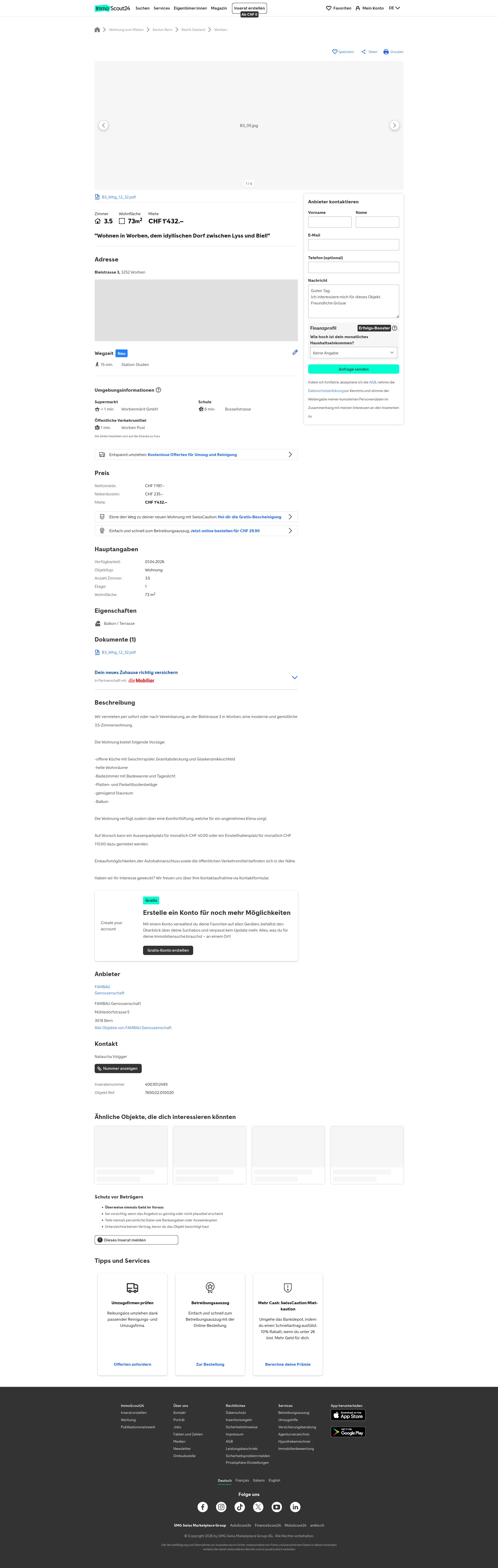 This 3.5-room apartment at Bielstrasse 3, 3252 Worben offers 73 m² of living space.