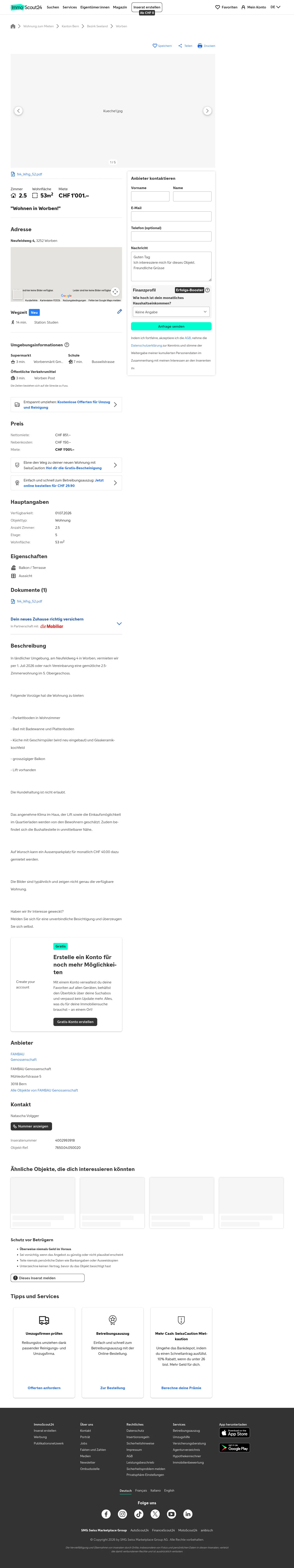 This 2.5-room apartment at Neufeldweg 4, 3252 Worben offers 53 m² of living space and is located on the 5th floor.
