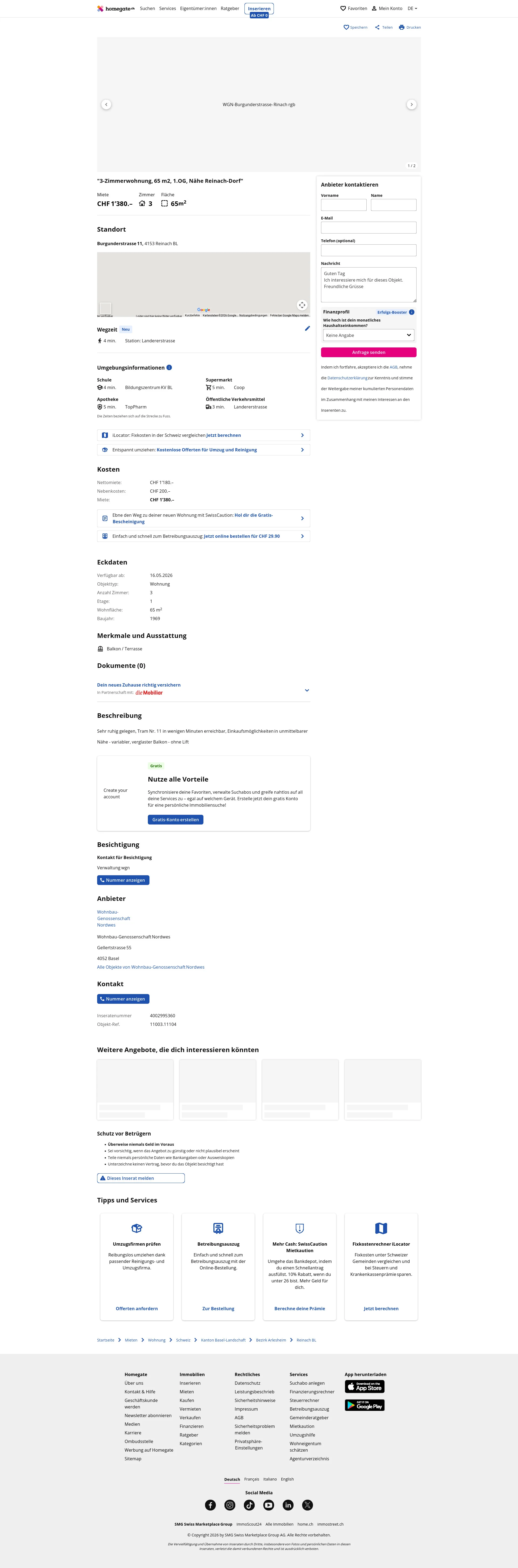 This 3.0-room apartment in Reinach (4153) provides 65 m² of living space.