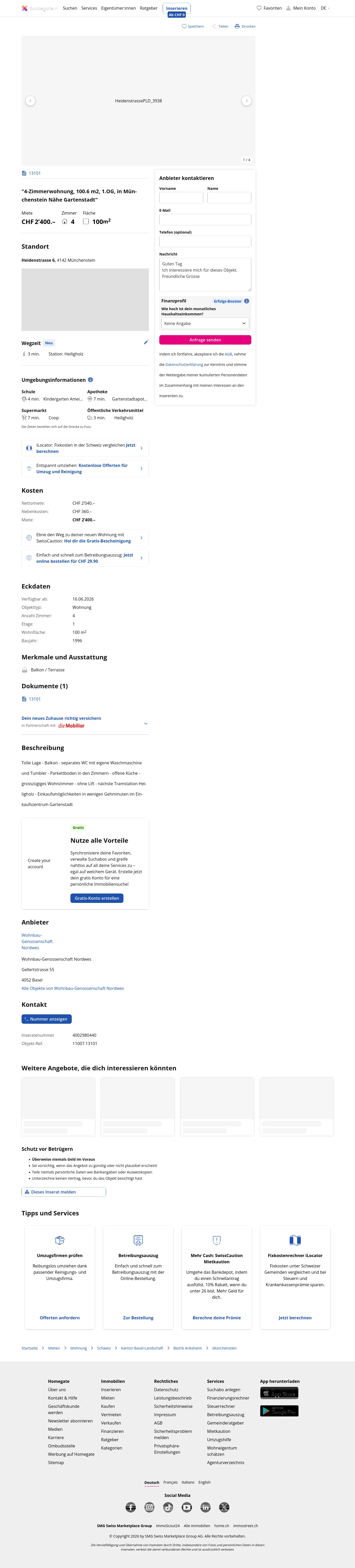 This 4.0-room apartment in Münchenstein (4142) offers 100 m² of living space.