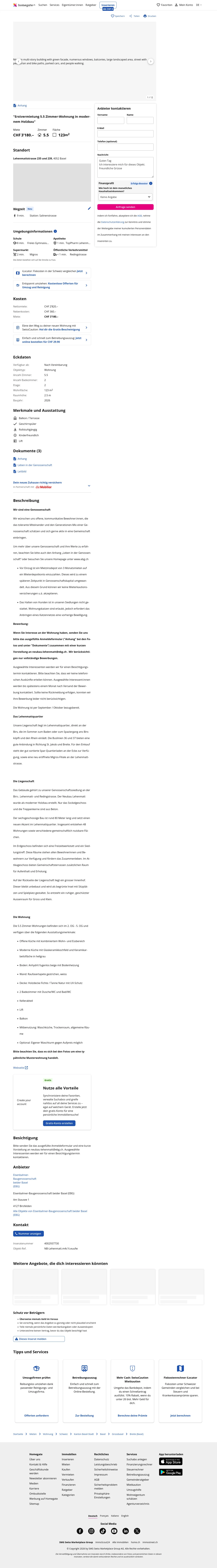 This 5.5-room apartment in Basel (4052) offers 123 m² of living space. Rent: CHF 3180/month. The cooperative is Eisenbahner-Baugenossenschaft beider Basel (EBG).
