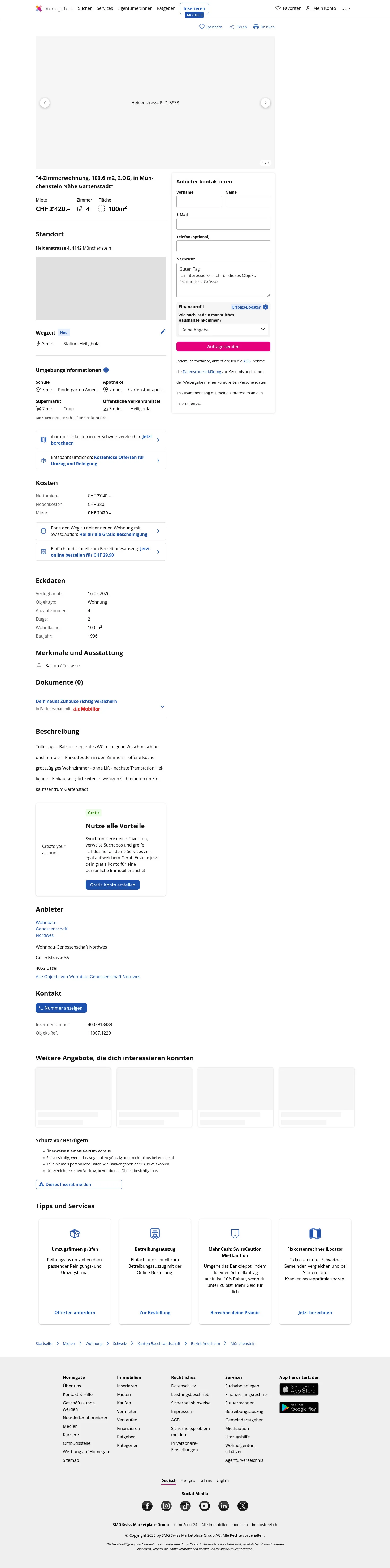 This 4.0-room apartment in Münchenstein (4142) offers 100 m² of living space.