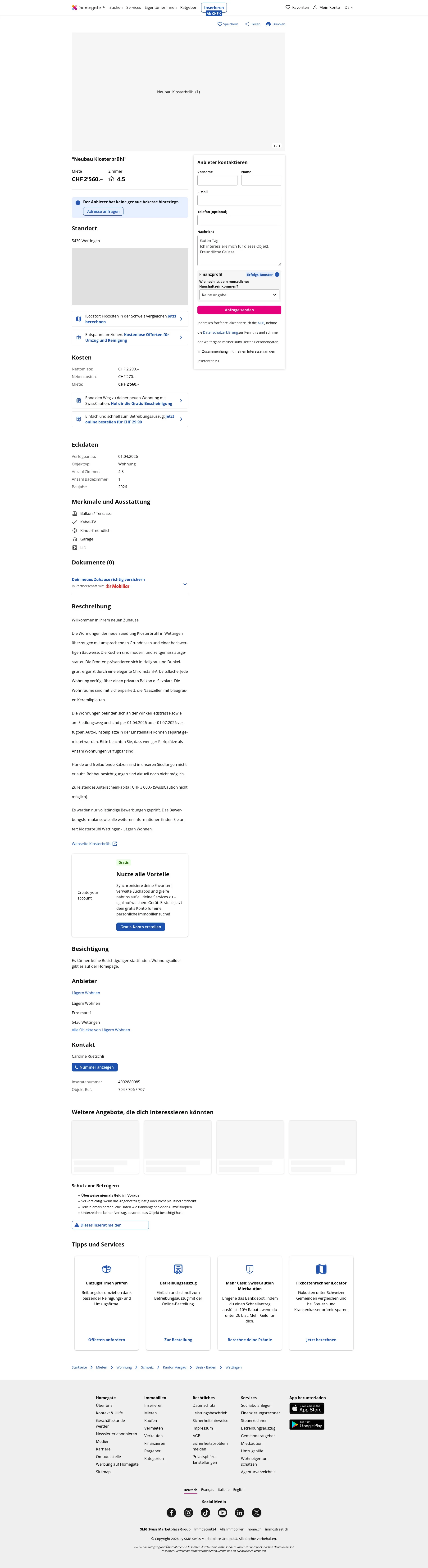 This 4.5-room apartment in Wettingen (5430) is part of the Klosterbrühl development managed by Lägern Wohnen.
