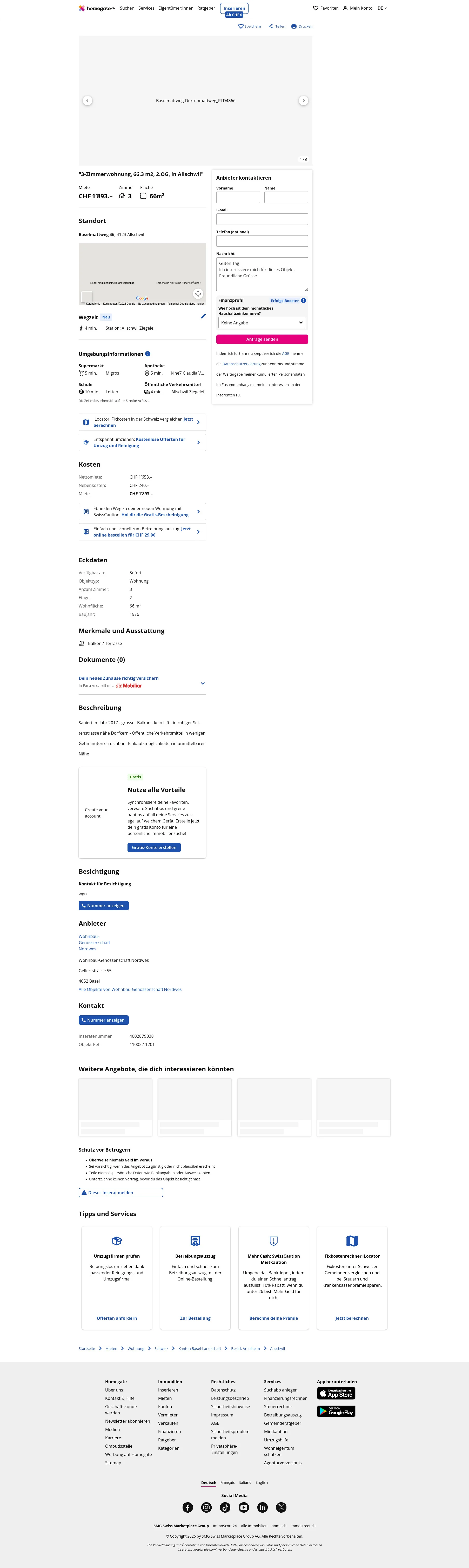 This 3.0-room apartment in Allschwil (4123) offers 66 mÂČ of living space.