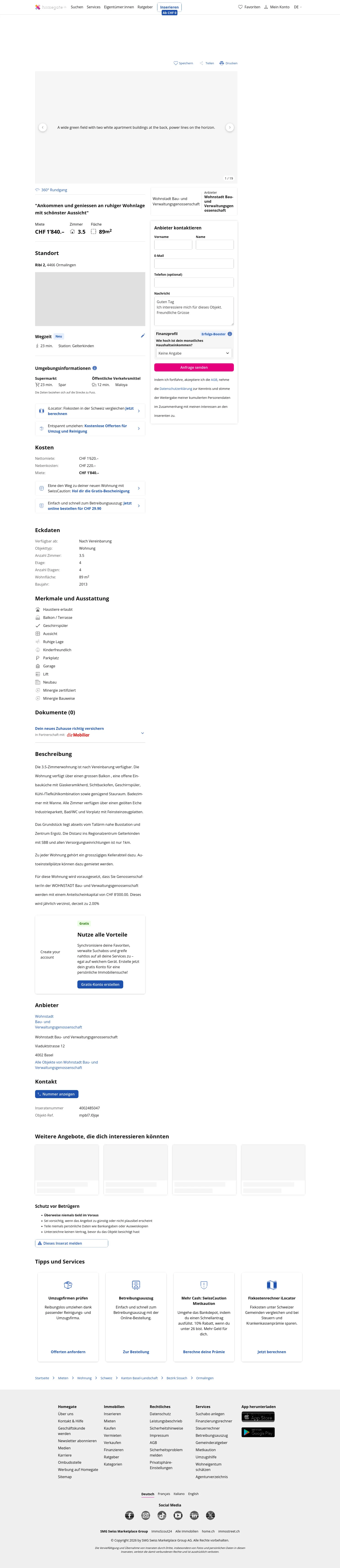 This 3.5-room apartment in Ormalingen (4466) offers 89 mÂČ of living space and is available by arrangement.