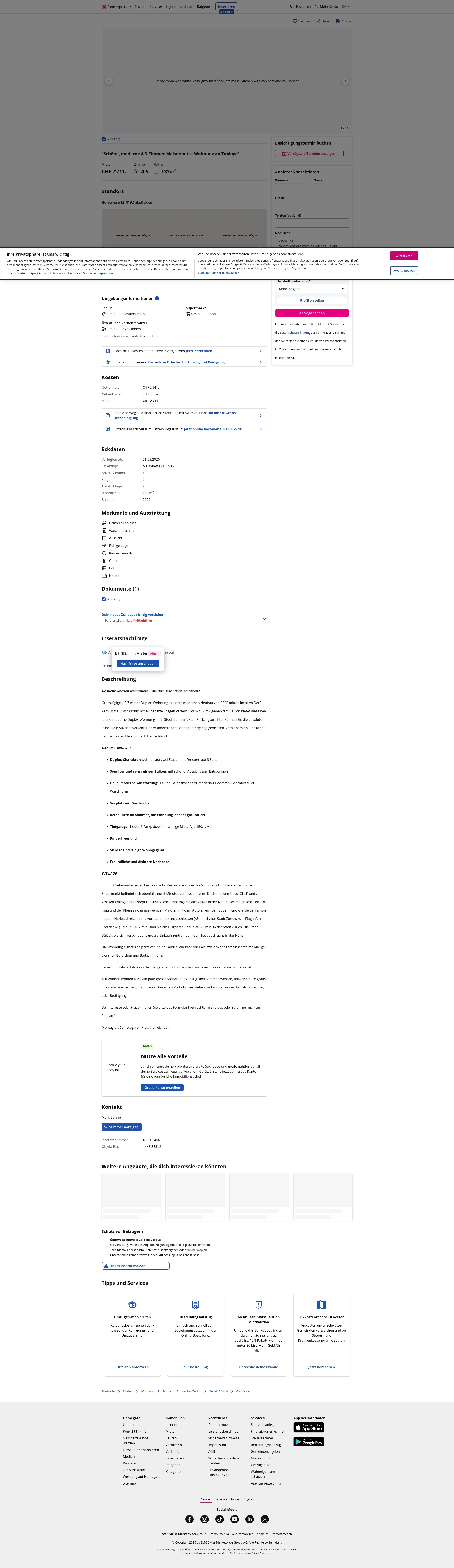 This 4.5-room apartment in Glattfelden (8192) offers 133 m² of living space. Rent: CHF 2,711/month