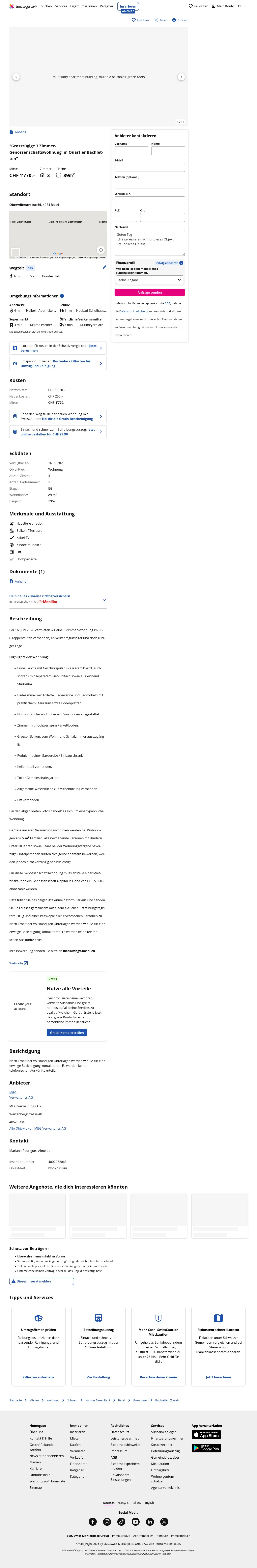 This 3.0-room apartment in Basel (4054) offers 89 mÂČ of living space and is available from 16 June 2026.