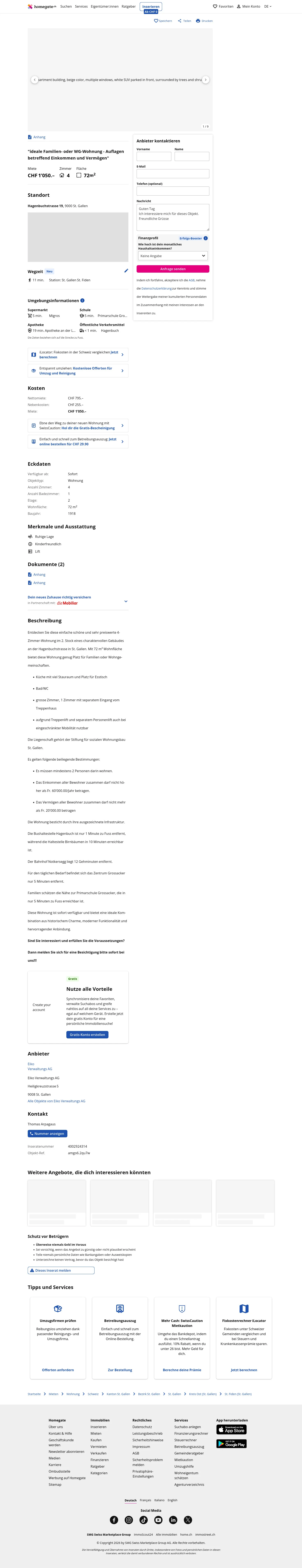 This 4.0-room apartment on the 2nd floor of a characterful building on Hagenbuchstrasse in St. Gallen (9000) offers 72 m² of living space and is aimed at families or shared households.