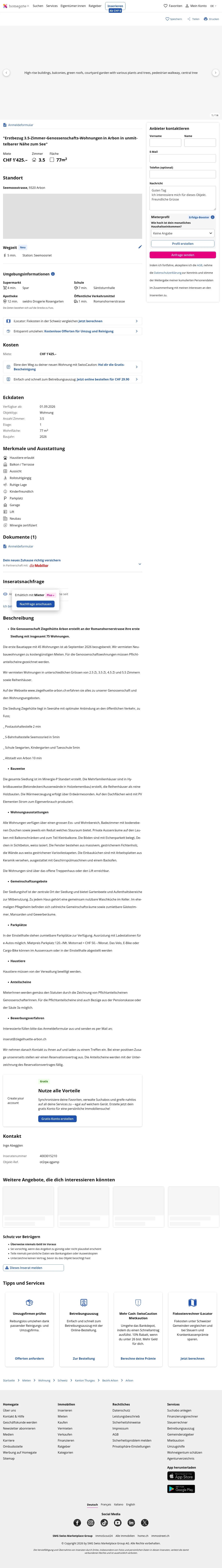 This 3.5-room apartment in Arbon (9320) has a living space of 77 m². The rent is CHF 1,425/month. Available from: 01.09.2026.