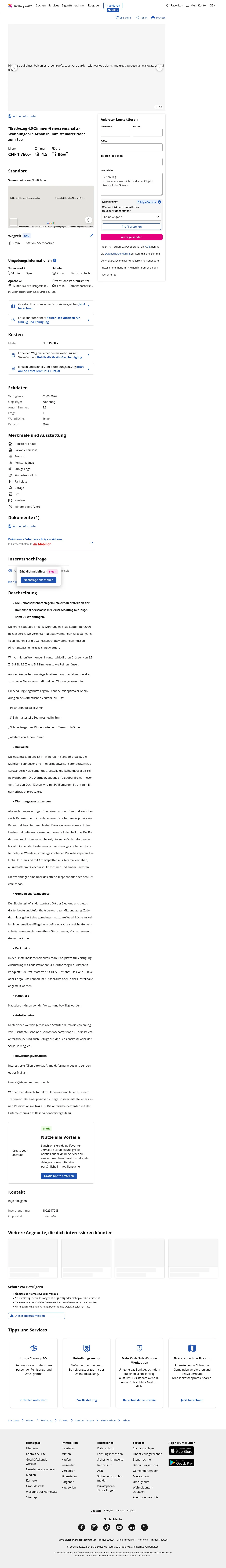 The Genossenschaft Ziegelhütte Arbon is constructing a new settlement on Romanshornerstrasse. The first construction phase comprises 45 apartments and is ready for occupancy from September 2026. The settlement includes a total of 75 apartments once completed. For the cooperative apartments, Pflichtanteilscheine must be subscribed; payments from pension funds or Säule 3a are possible for these shares.