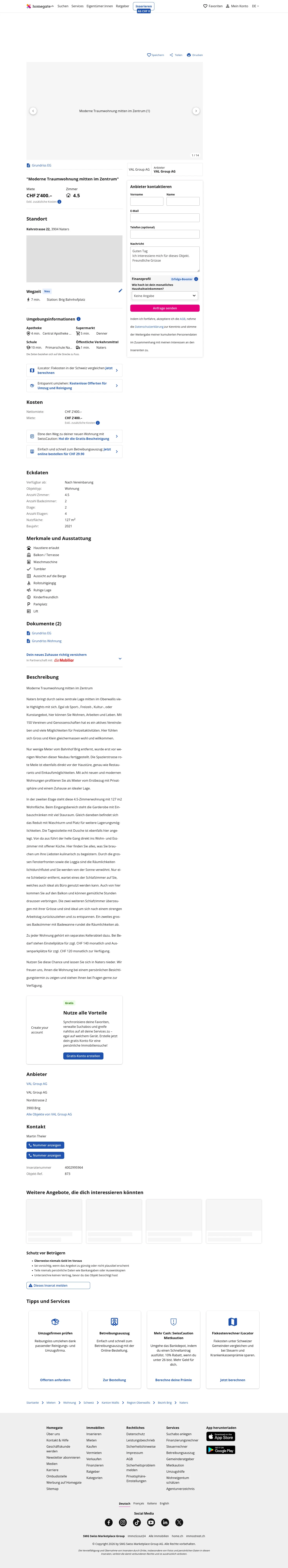 This 4.5-room apartment in Naters (3904) offers 127 m² of living space on the 2nd floor of a newly completed building finished a few weeks ago. The building is located a few metres from Brig railway station and directly adjacent to the promenade known as the "rote Meile". The property is one of eight new apartments and is available as a first-occupancy unit.
