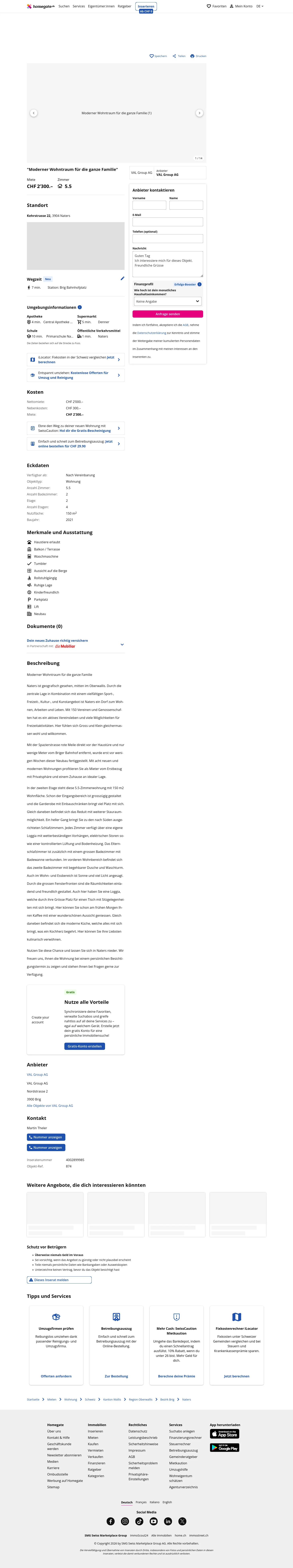 Naters is centrally located in the Upper Valais with a diverse range of sports, leisure, culture and art offerings. The municipality has an active community life with around 150 associations and cooperatives. The pedestrian promenade "Rote Meile" is directly outside the building and the property is only a few meters from Briger Bahnhof.