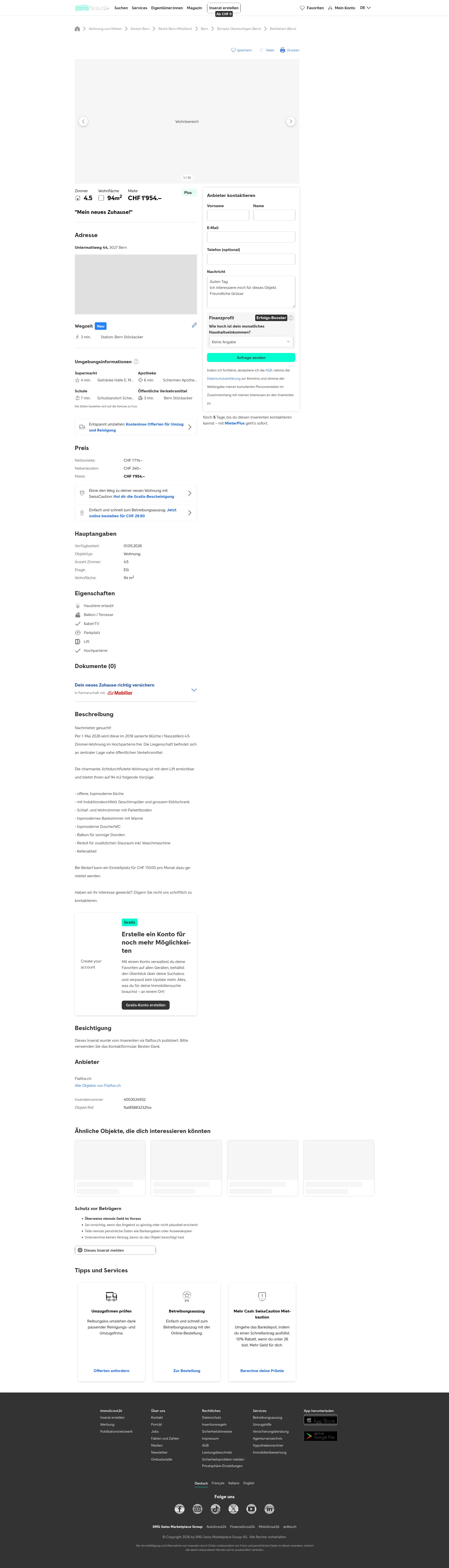This 4.5-room apartment in Bern (3027) offers 94 m² of living space. Rent: CHF 1,954/month.