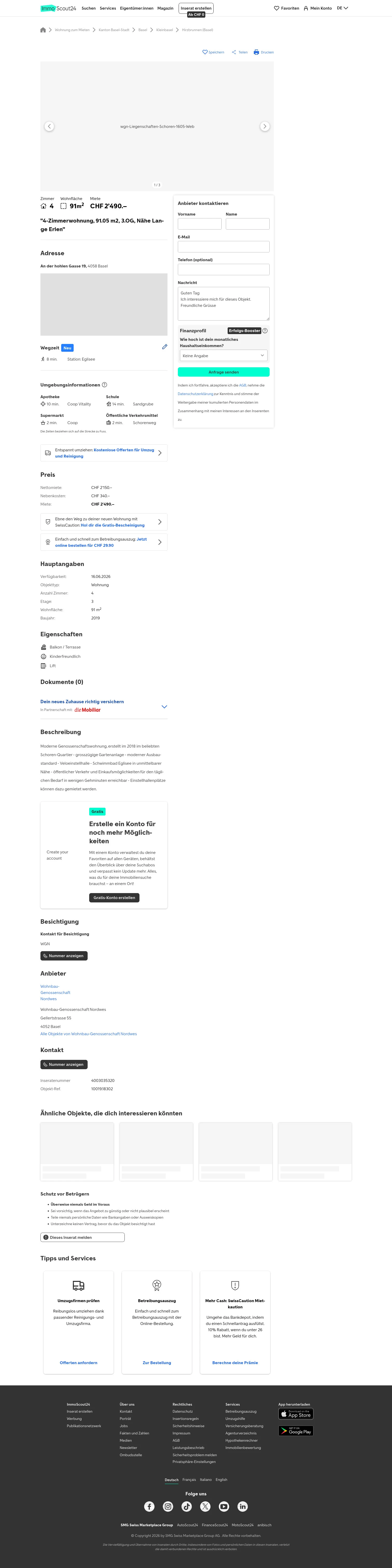 This 4.0-room apartment in Basel (4058) offers 91 m² of living space.