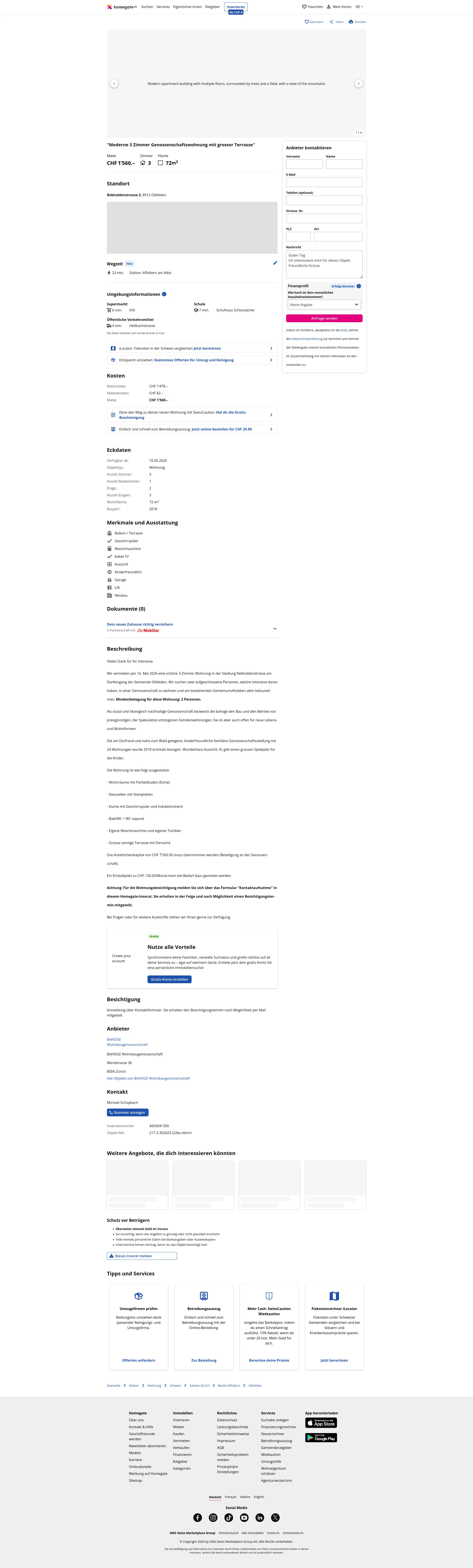 The apartment is located in the settlement on Rebhaldenstrasse at the village entrance. It is part of the BAHOGE Wohnbaugenossenschaft.