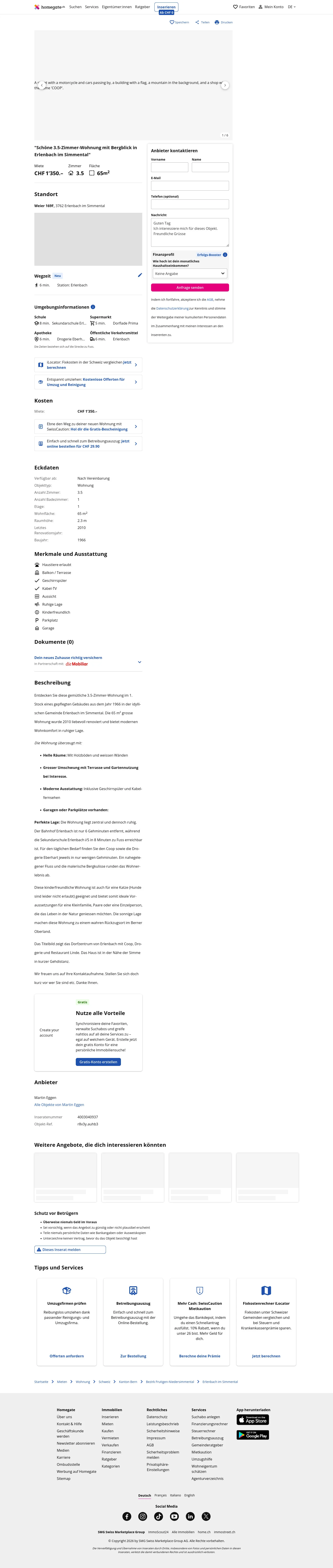 This 3.5-room apartment of 65 m² is located on the 1st floor of a building from 1966 in Erlenbach im Simmental (3762). The apartment was renovated in 2010 and is affiliated with the cooperative Gemeinde Erlenbach.